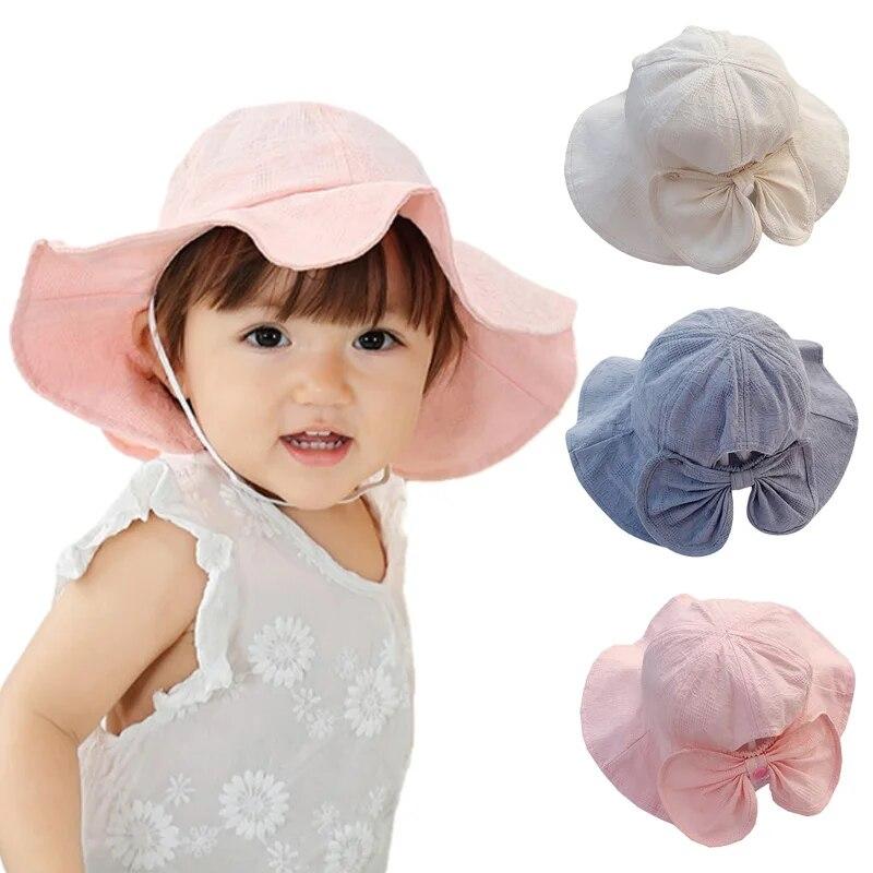 Детская панама для девочек от 1 до 3 лет, кепка от солнца с большими полями и бантом, летние пляжные детские рыбацкие шапки с ветрозащитной веревкой, аксессуары для детей