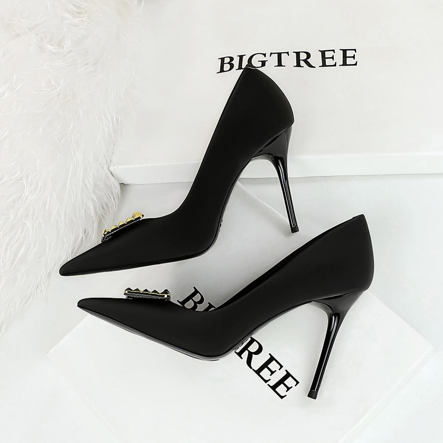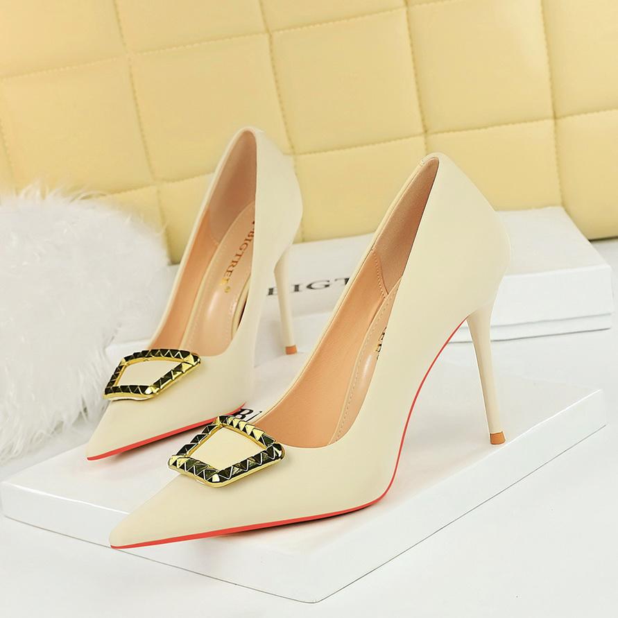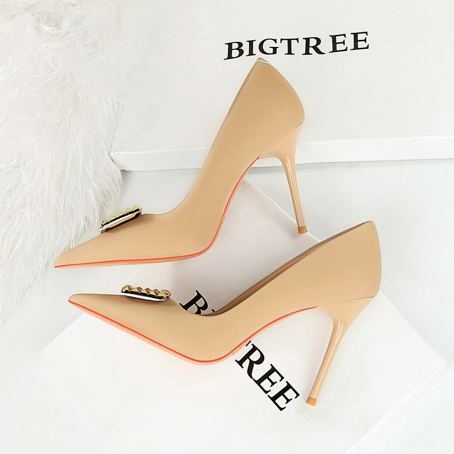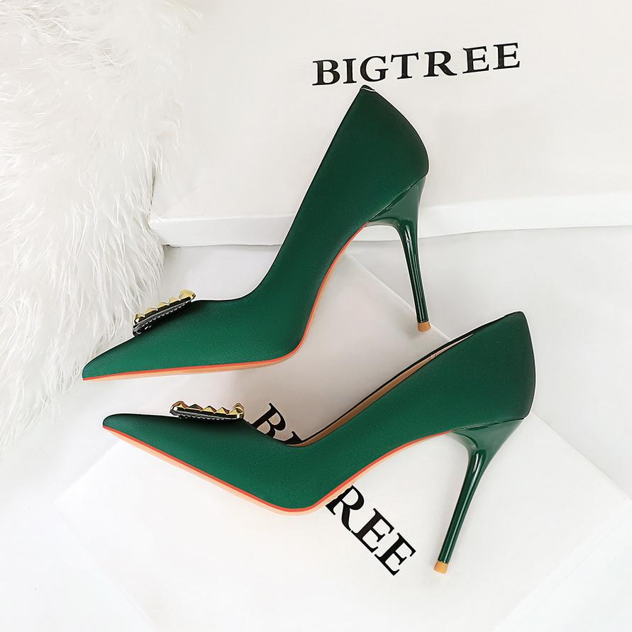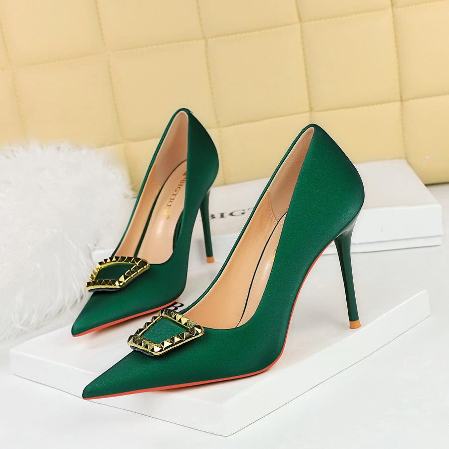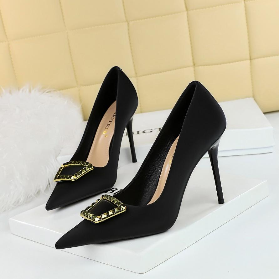 Женские модные банкетные туфли на высоком тонком каблуке, высокие каблуки с острым носком и металлической пряжкой, декоративные одинарные туфли