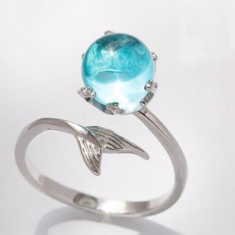 Кольцо с открытым рыбьим хвостом русалки, регулируемое кольцо из синего стекла для женщин