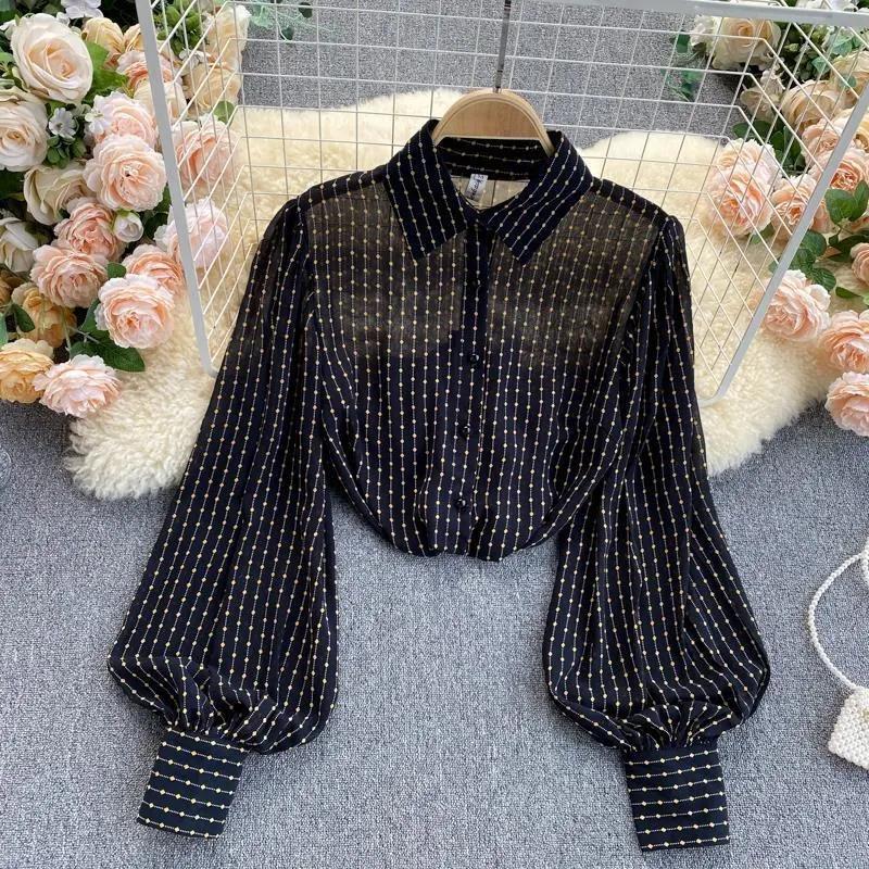 Шифоновая рубашка с длинными рукавами, женская французская винтажная свободная женская рубашка с рукавами-фонариками, топ в горошек