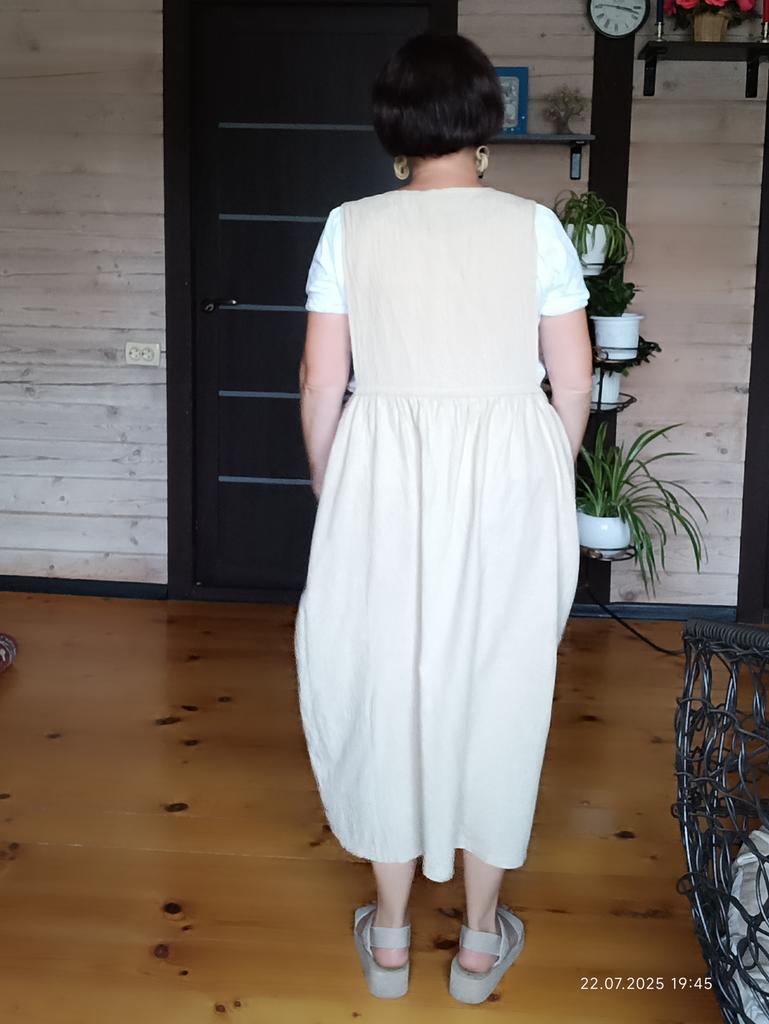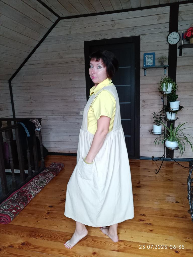Сарафан очень понравился ! Казалось бы простенький фасон, но можно безконечно комбинировать с разными по цвету блузами , футболками, за счет цвета смотрится выигрышно. Приятный к телу , ткань типа плотной марлевки, сшит аккуратно . Хочется носить и носить ) По размеру ориентировалась на ОГ, в талии велик , но можно носить свободно, можно с ремешком . Идеально вписался в мой новый образ и бомбер, купленный также в Джуме . Благодарю производителей и Джум ! Да! По длине мне бы хотелось подлиннее см на 10-15 . Но данный сарафан можно одевать и на платье подлиннее, что я и сделала , получилась многослойность и теплее для нашей прохлады . Можно одеть подьюбник , как на фото, можно и наставить широкой тесьмой или тканью , вообщем сарафан дает простор творческой фантазии , можно его и расшить , тогда получится нарядный вариант .