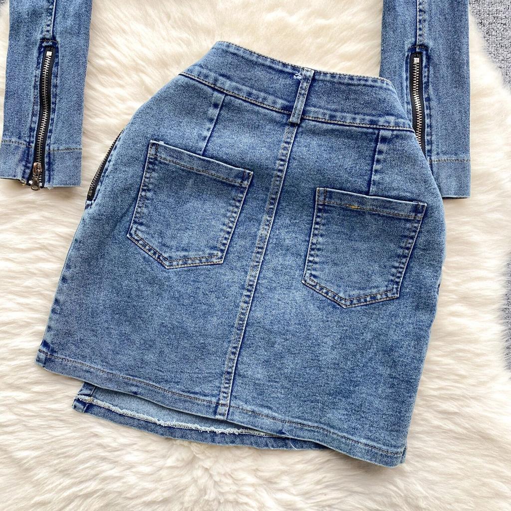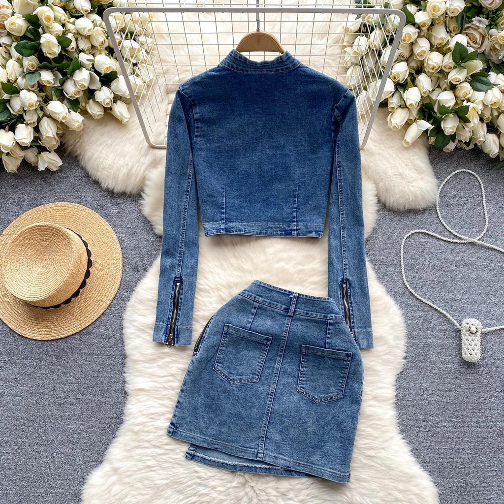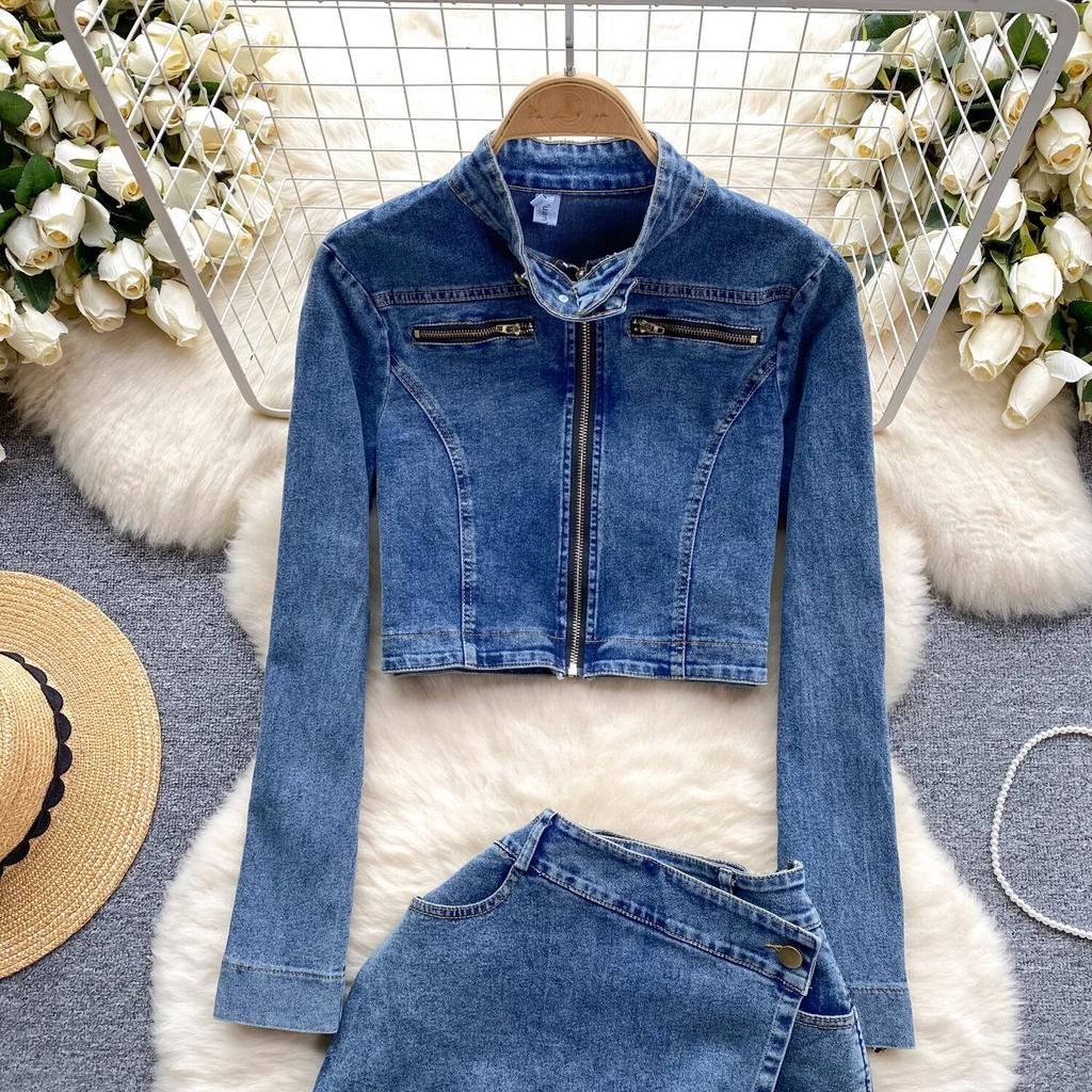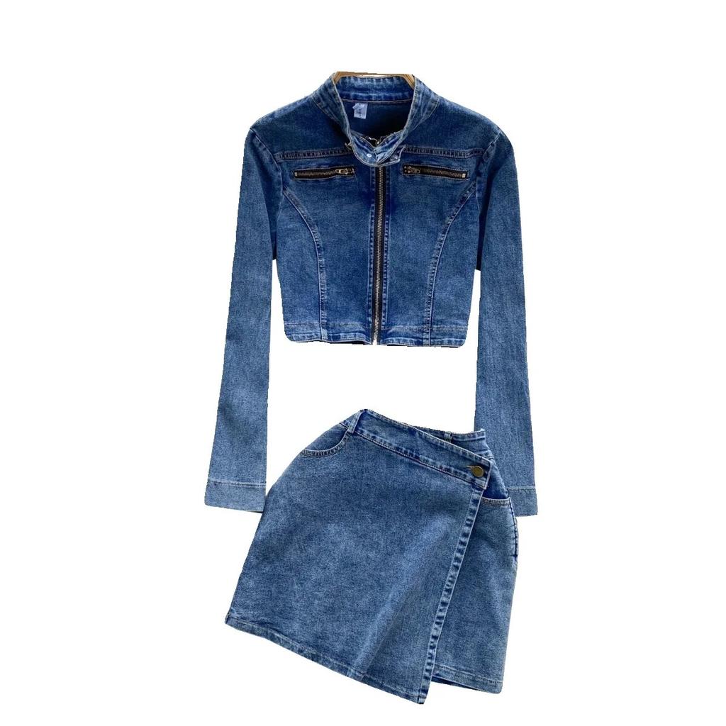 Американский винтажный джинсовый костюм, весенняя одежда, женский кардиган на молнии, верхняя одежда, универсальный дизайн, юбка Sense, комплект из двух предметов