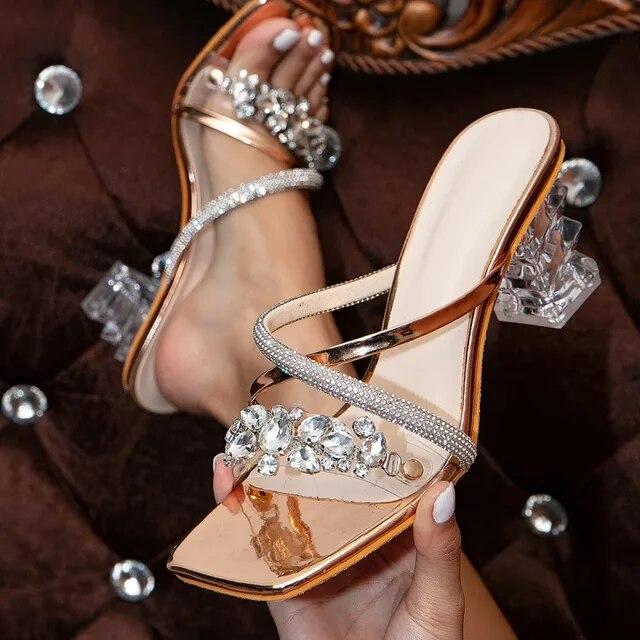 Новинка 2024 года, женские сандалии, летние модные прозрачные шлепанцы со стразами и квадратной головкой, женские сексуальные сандалии на толстом каблуке, женские сандалии для свадебной вечеринки
