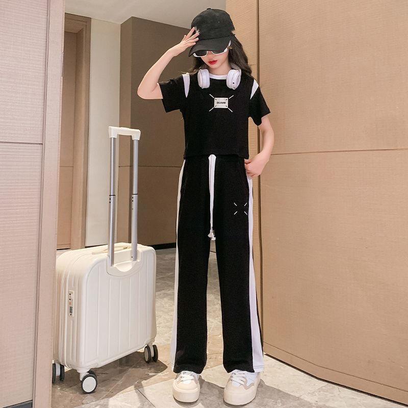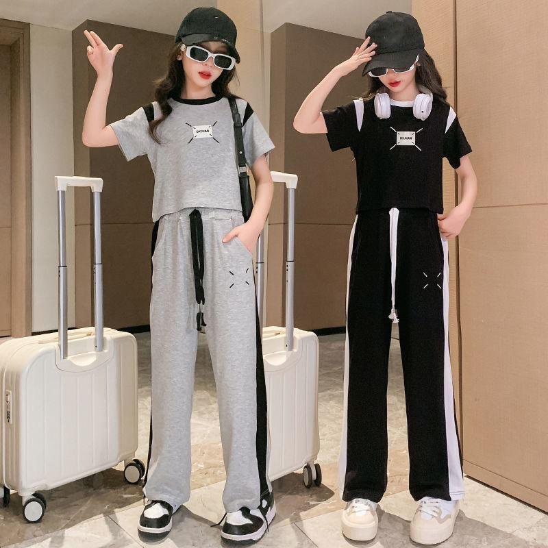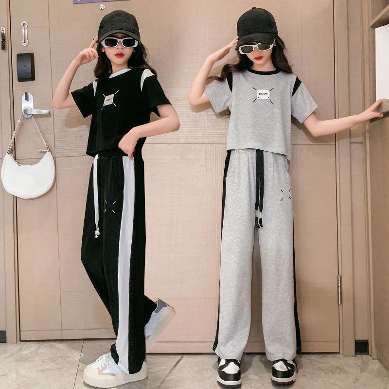 Спортивные комплекты для девочек-подростков, детская футболка с короткими рукавами + широкие брюки, костюм из 2 предметов, модный повседневный летний спортивный костюм