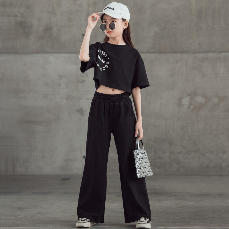 Одежда для девочек, летний костюм, повседневная футболка с буквами, широкие брюки с высокой талией, 2 детских спортивных костюма, черная одежда для подростков