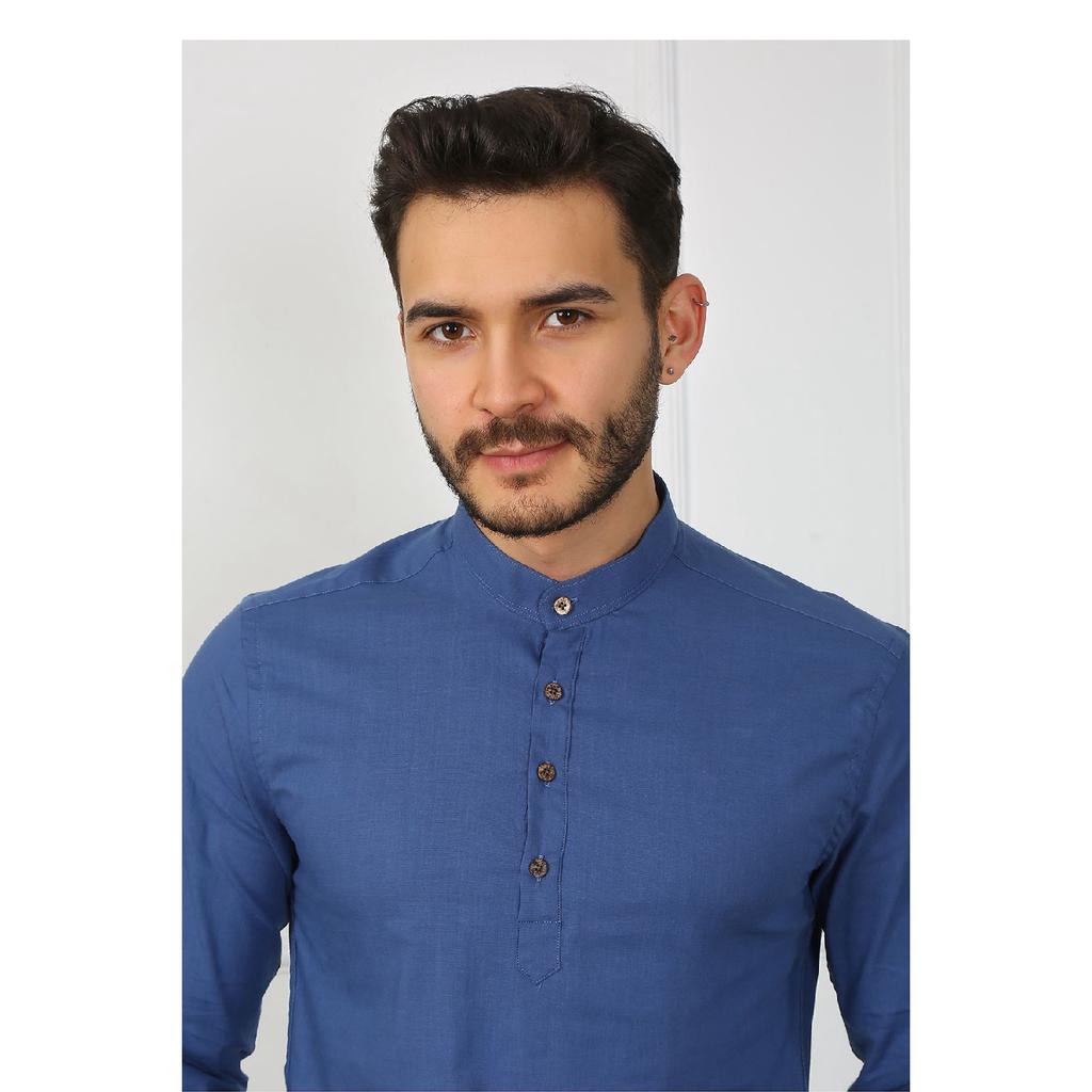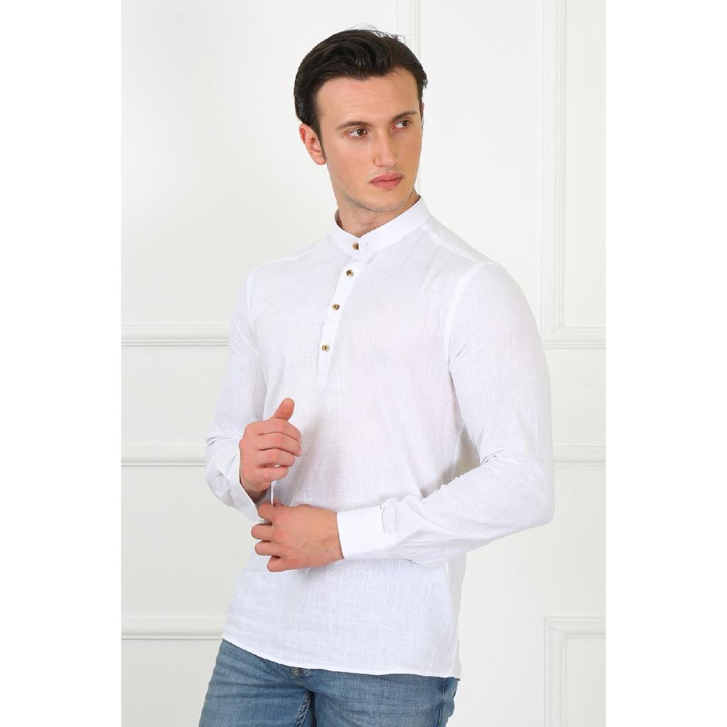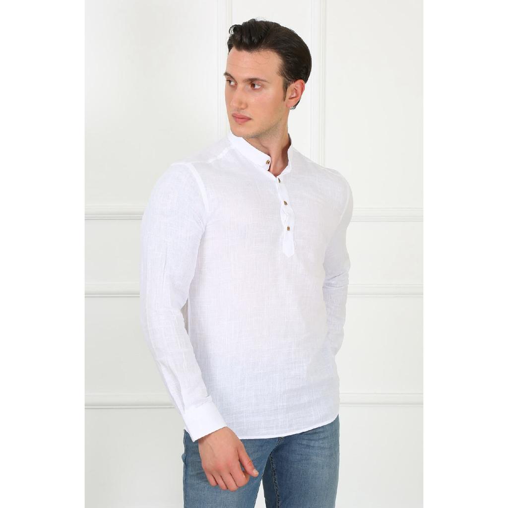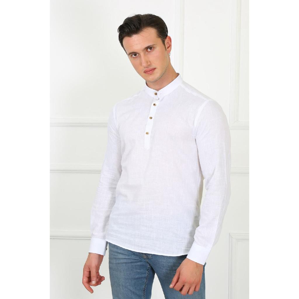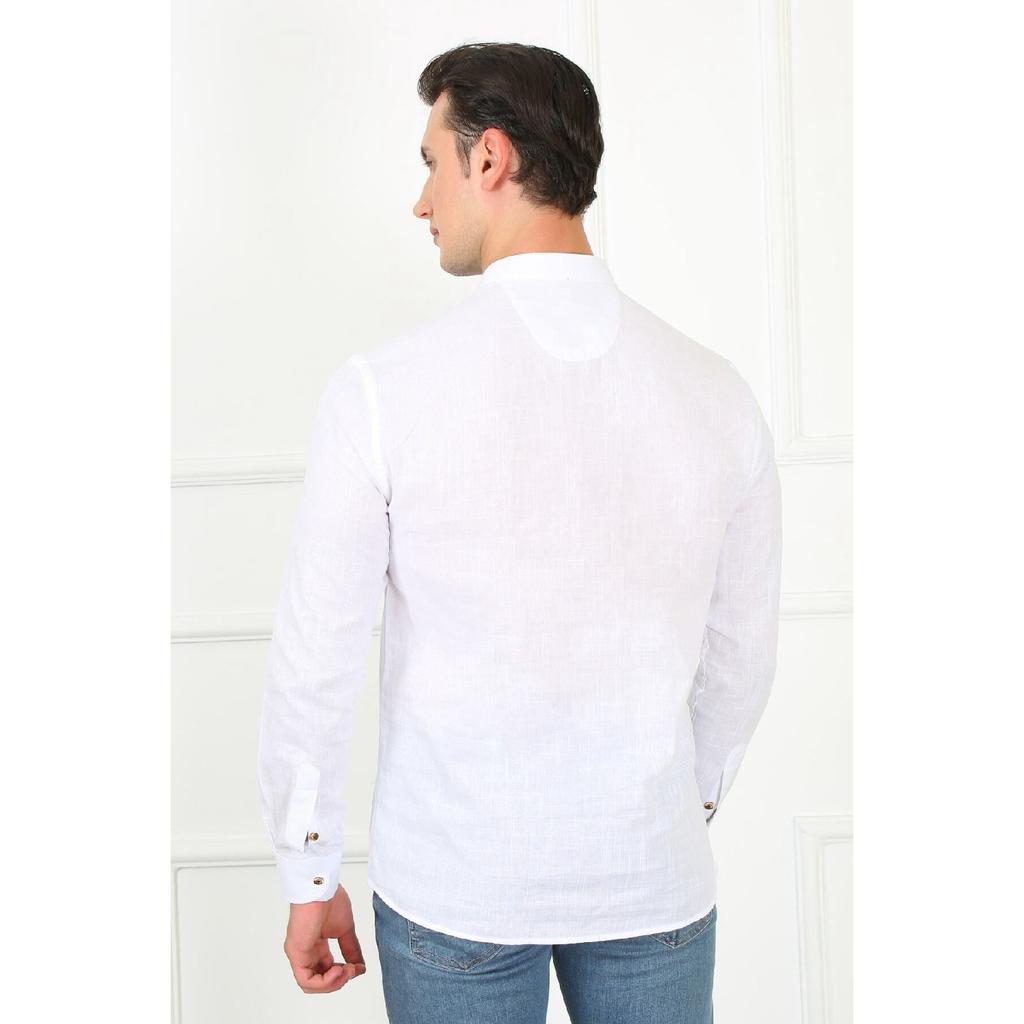 Приталенная льняная мужская рубашка с великолепным воротником на трех пуговицах