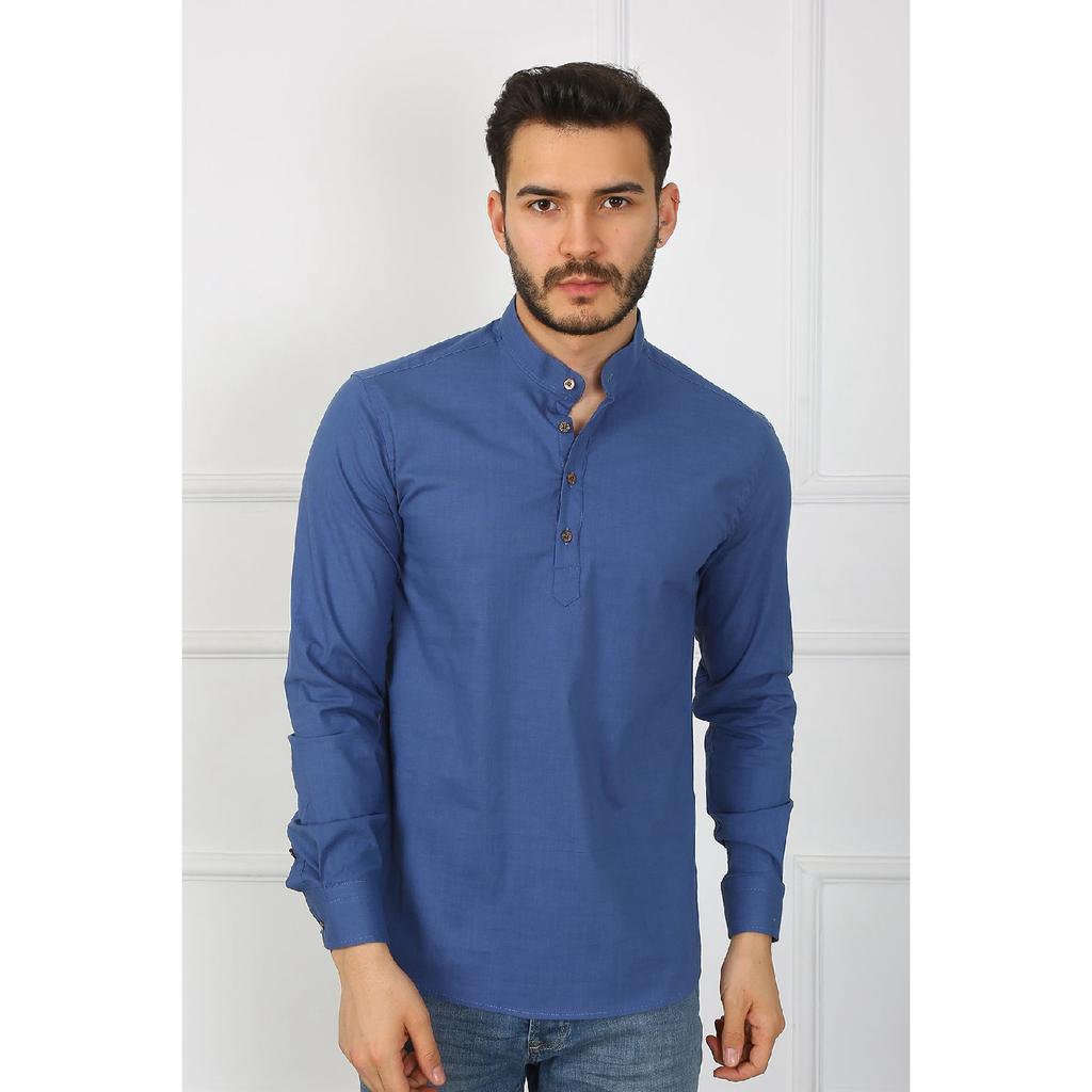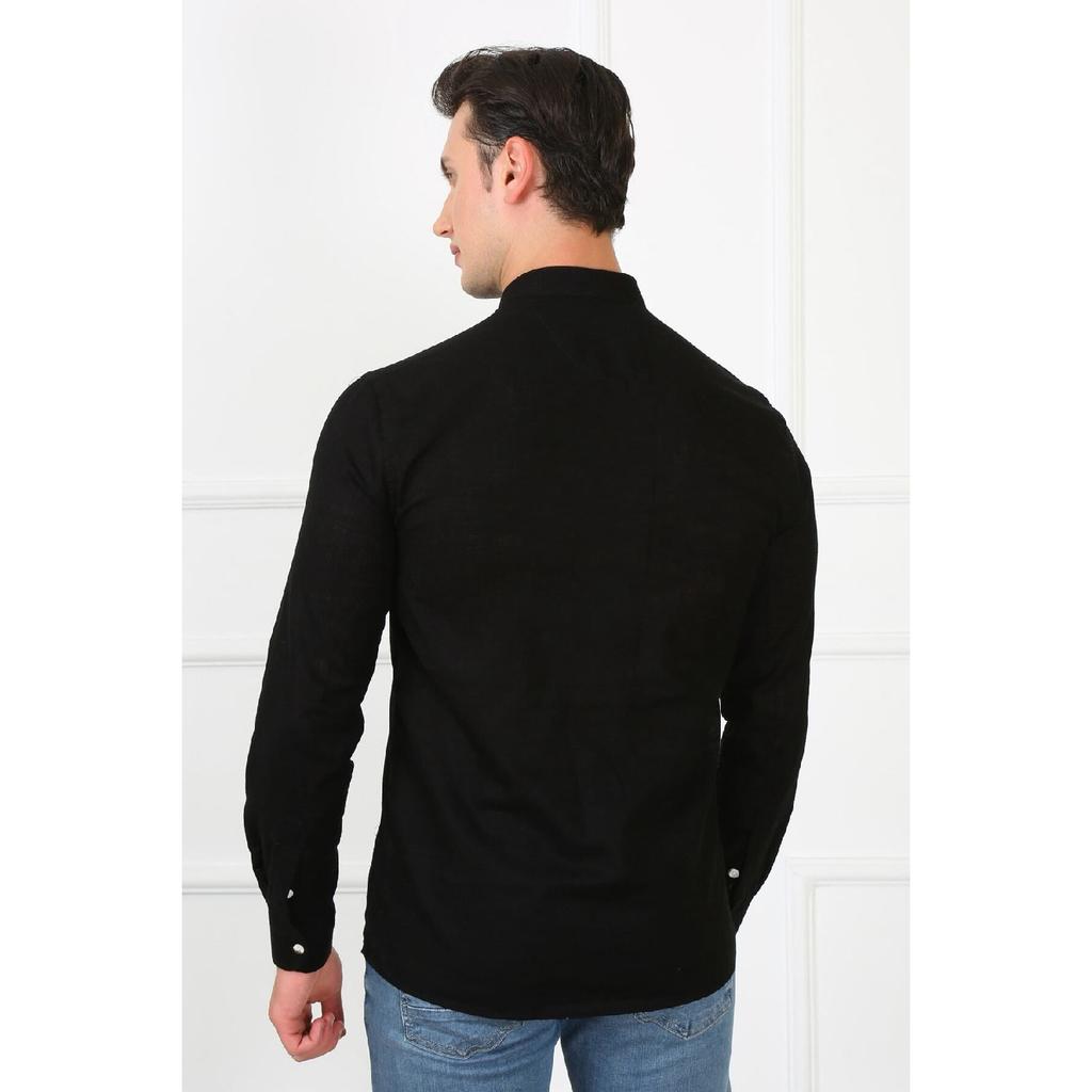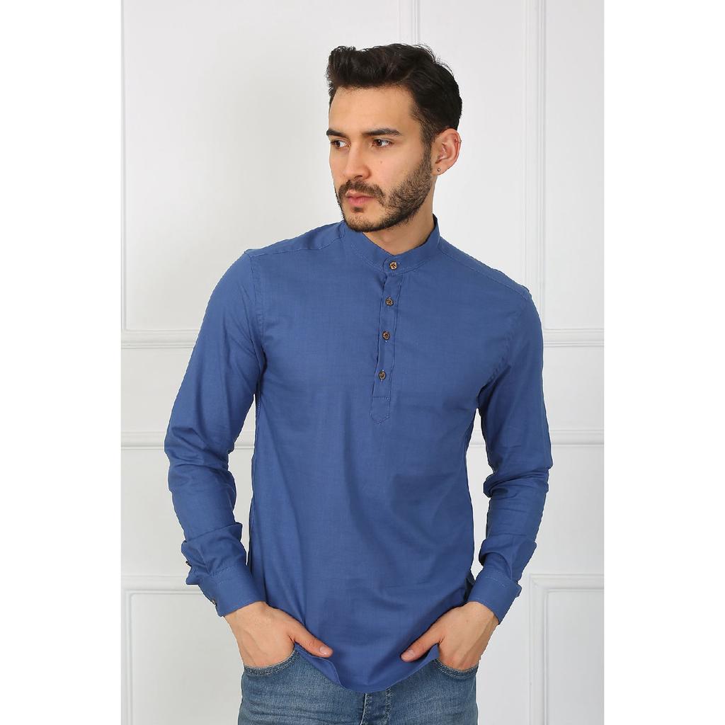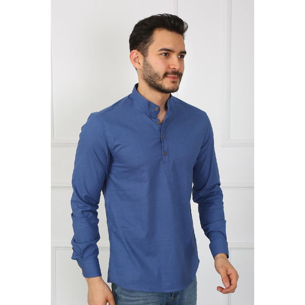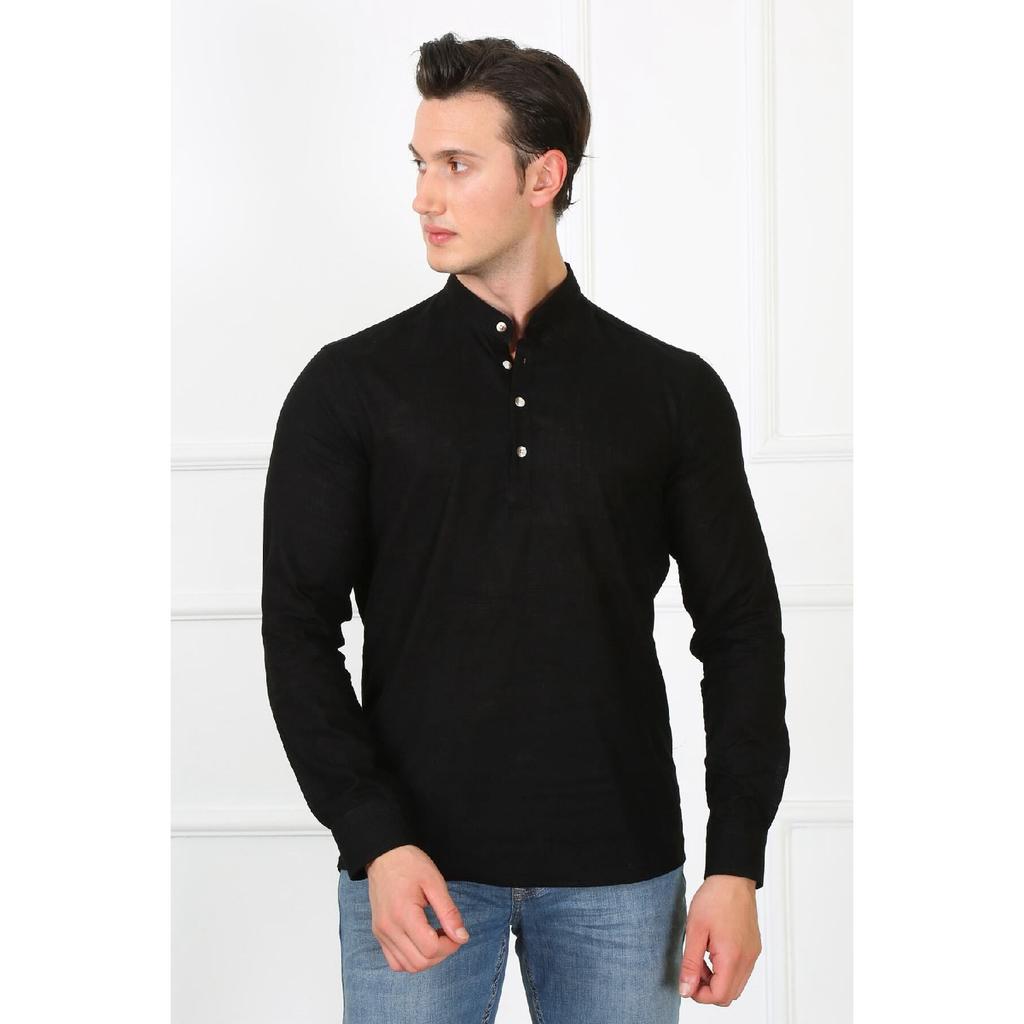 Приталенная льняная мужская рубашка с великолепным воротником на трех пуговицах