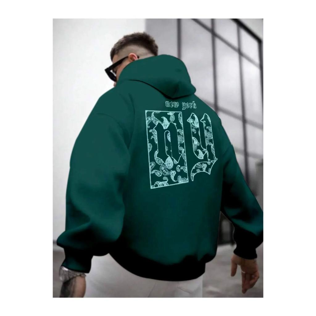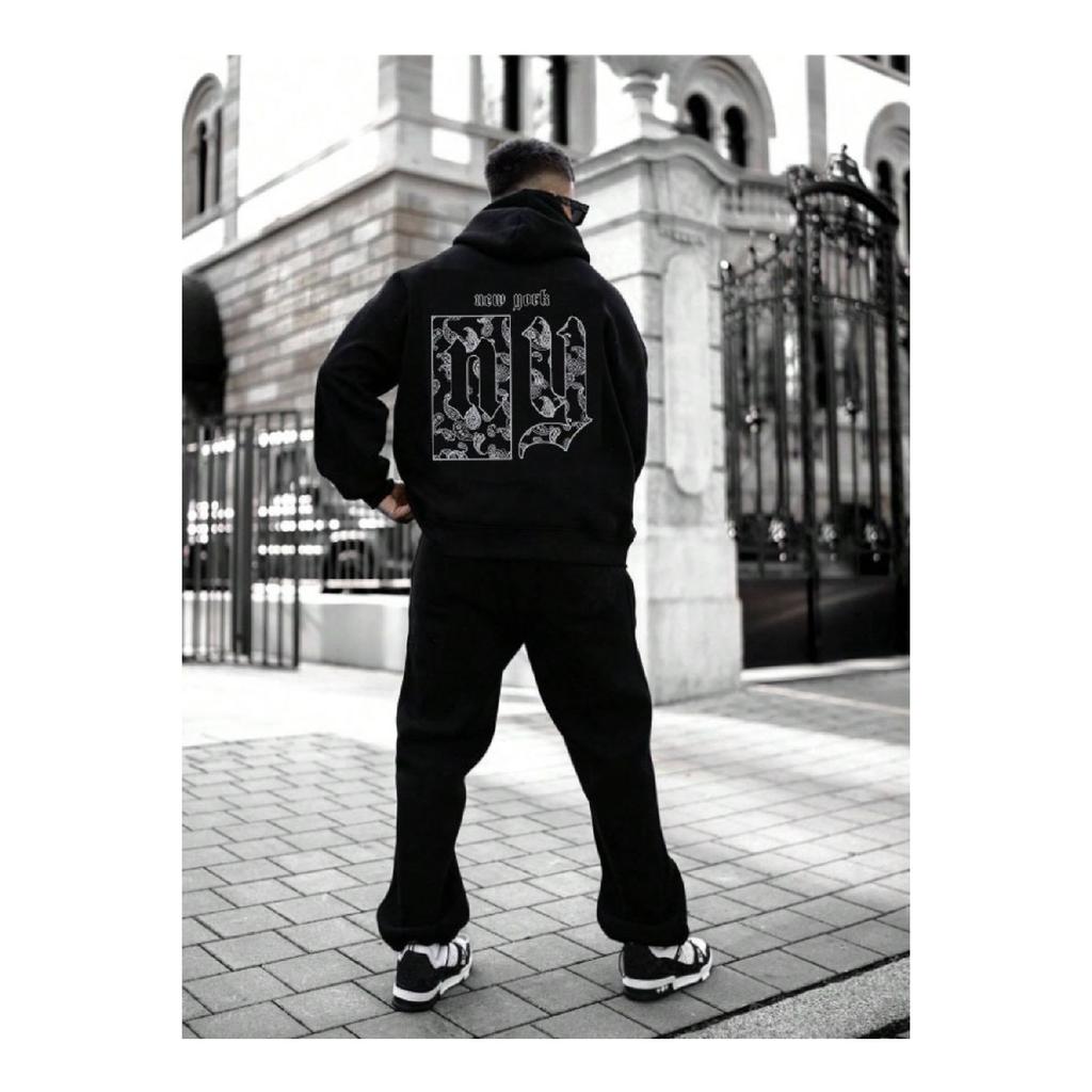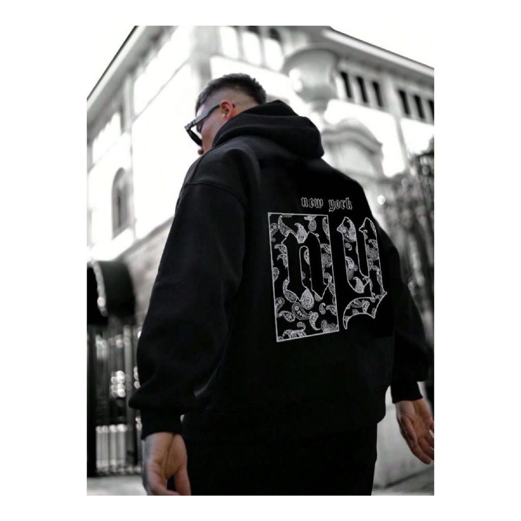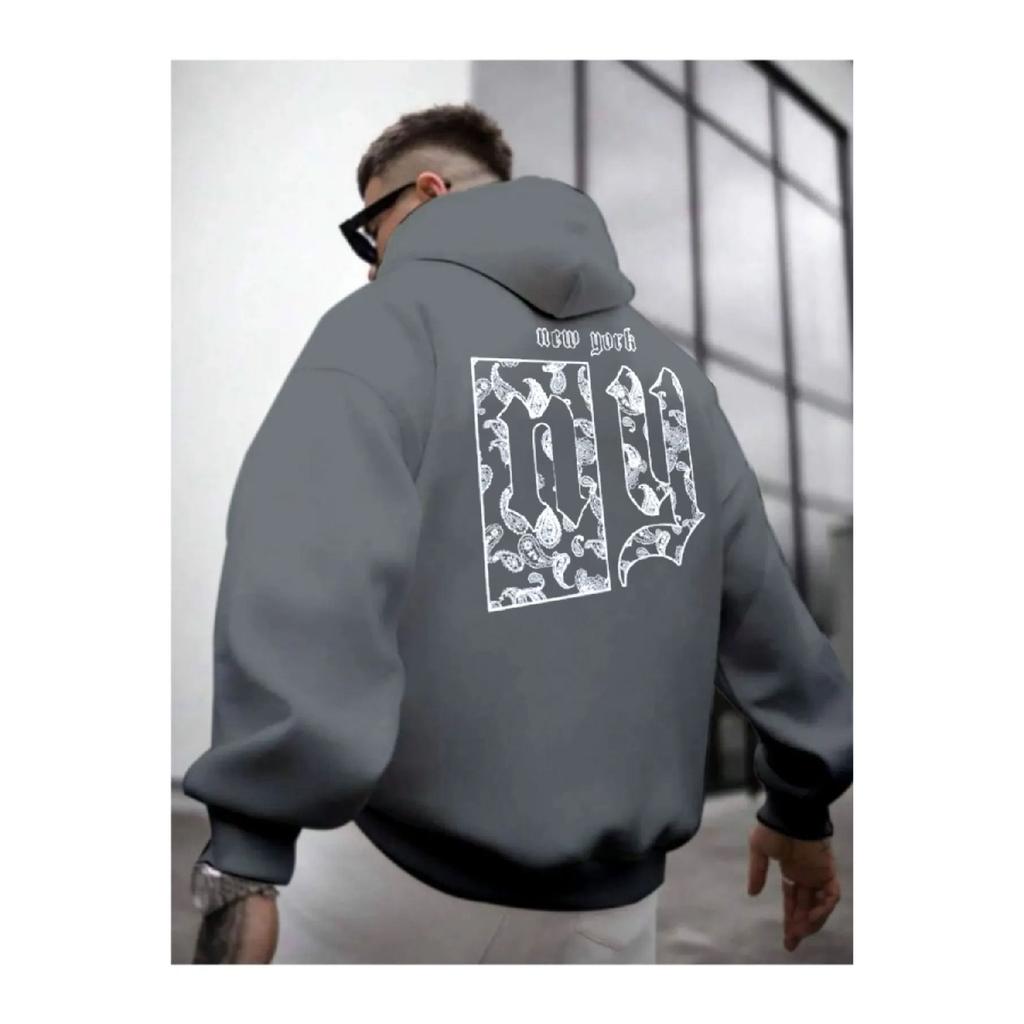 Мужская дымчато-серая толстовка с капюшоном и принтом на спине Ny