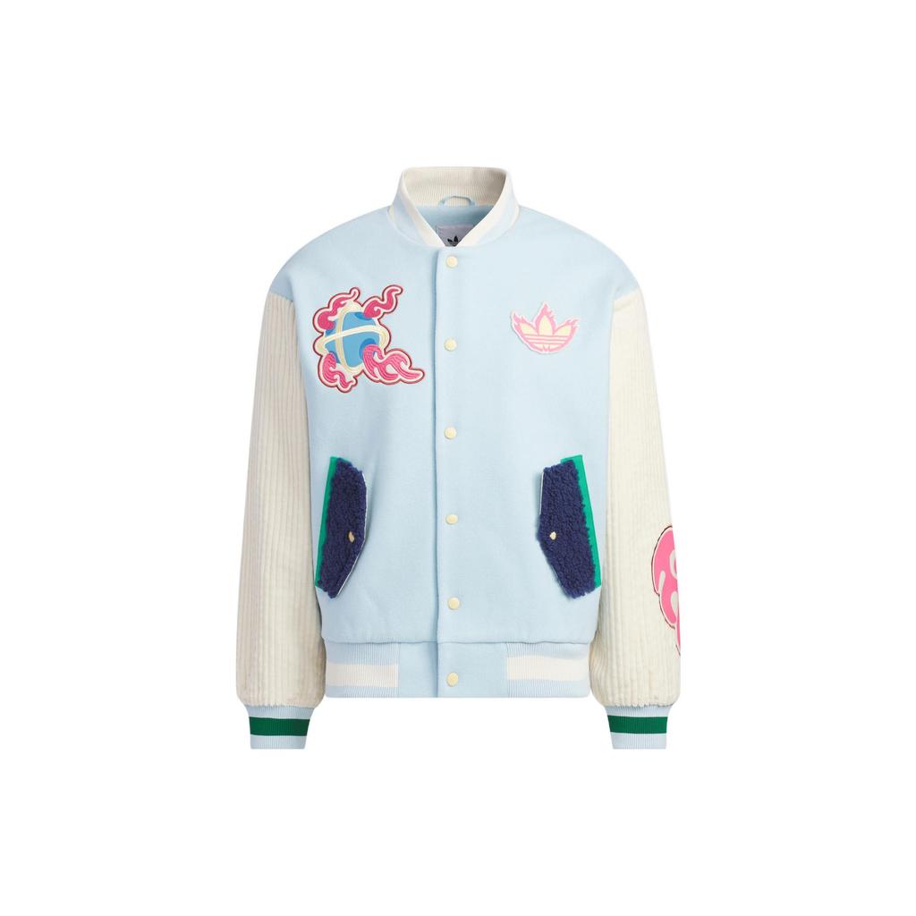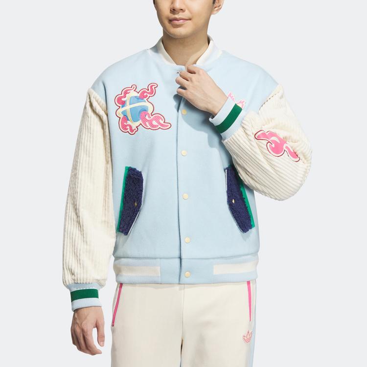Adidas Оригиналы Trefoil X Melting Sadness Китайский Новый год с логотипом кролика с мультяшной нашивкой, однобортная бейсбольная куртка, верхняя одежда унисекс, ледяной синий HY7248