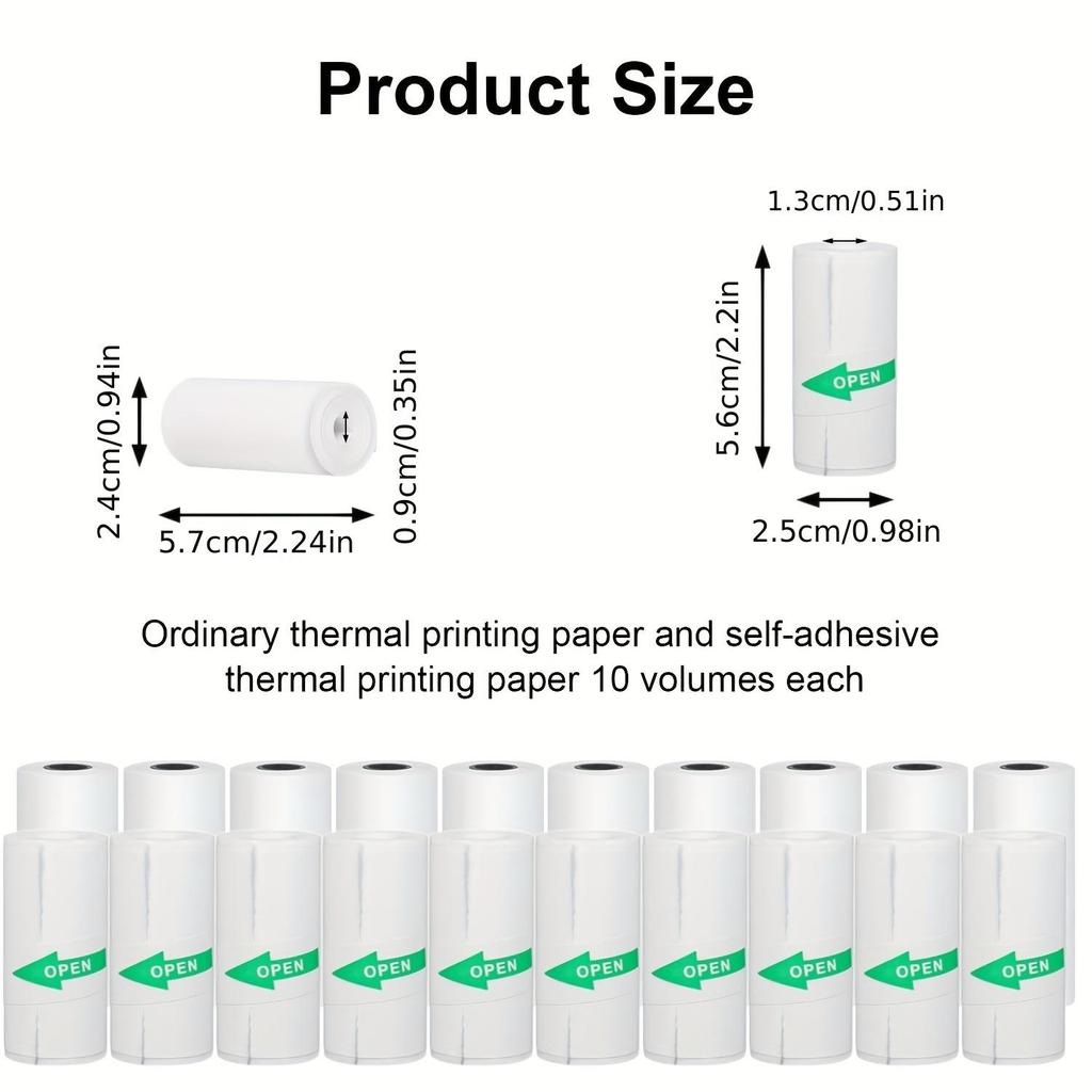 20 рулонов термофотобумаги, 10 рулонов термобумаги + 10 рулонов самоклеящихся наклеек, 5,7 x 25 мм, бумага для мини-принтера