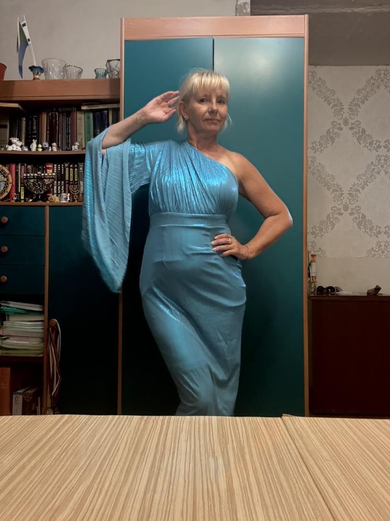 Платье шикарное. Размер S подошел на 44 российский и рост 160 до голеностопа . Ткань немного тянется. Цвет очень красивый, немного с голографическим блеском. Качество пошива отличное. Есть подклад. Конечно фигура уже не идеальная и область живота обтянута. Но чувствуешь в нем королевой. Я в восторге . Это платье фаворит на свадьбу