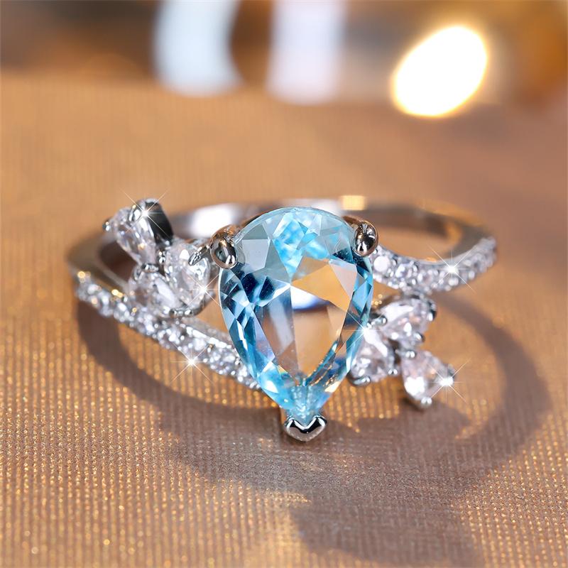 Модное серебристое кольцо Bi Tear Drop Aqua Blue с камнем, роскошное обручальное кольцо Love, винтажные свадебные кольца с каплями воды