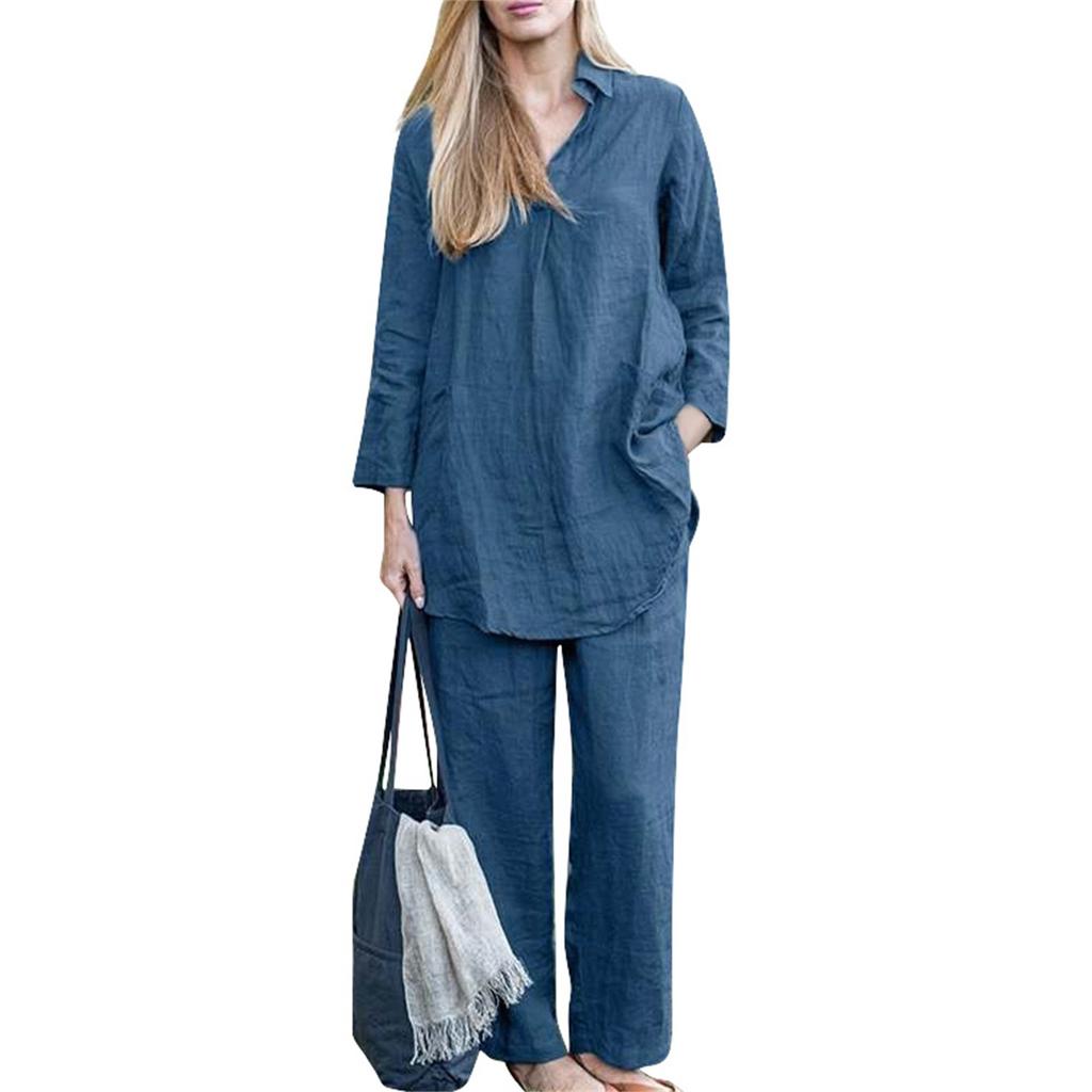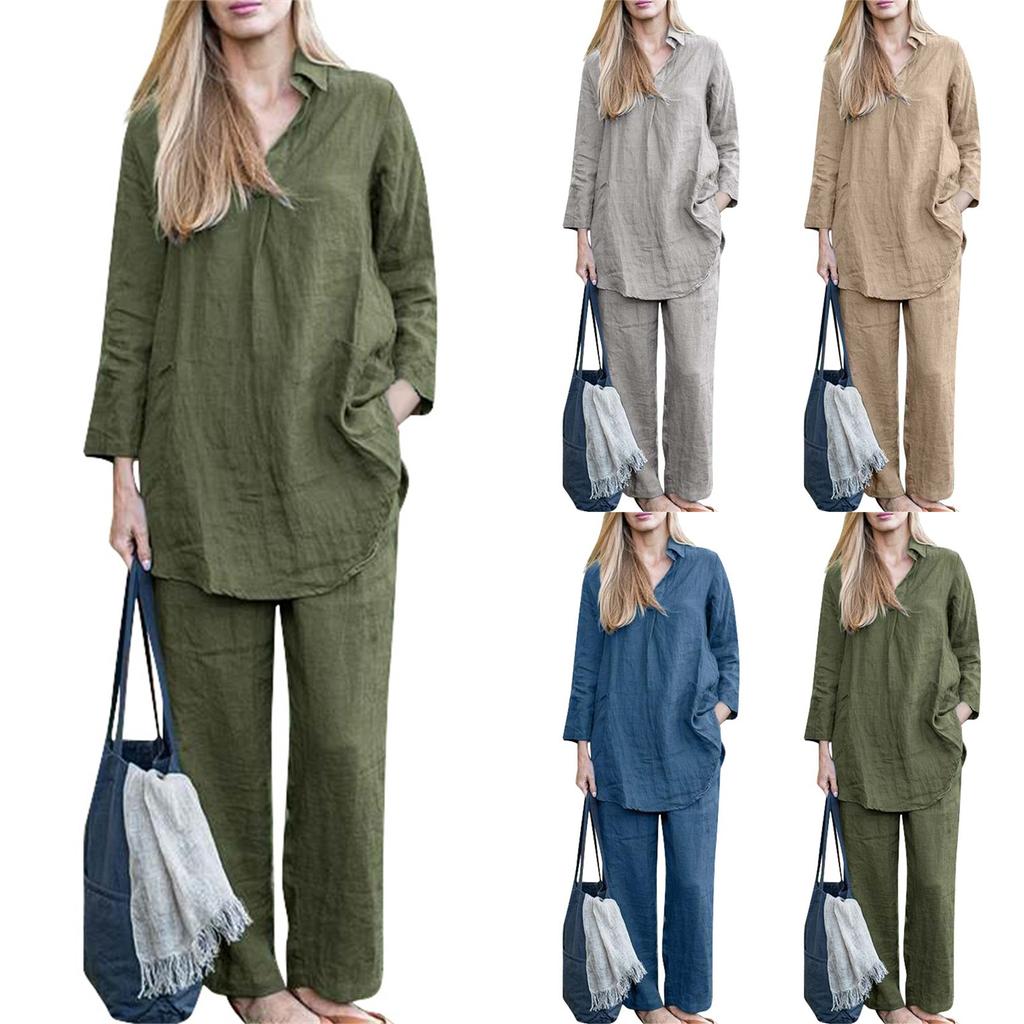 Женский повседневный модный универсальный формальный однотонный комплект из хлопка и льна с длинными рукавами