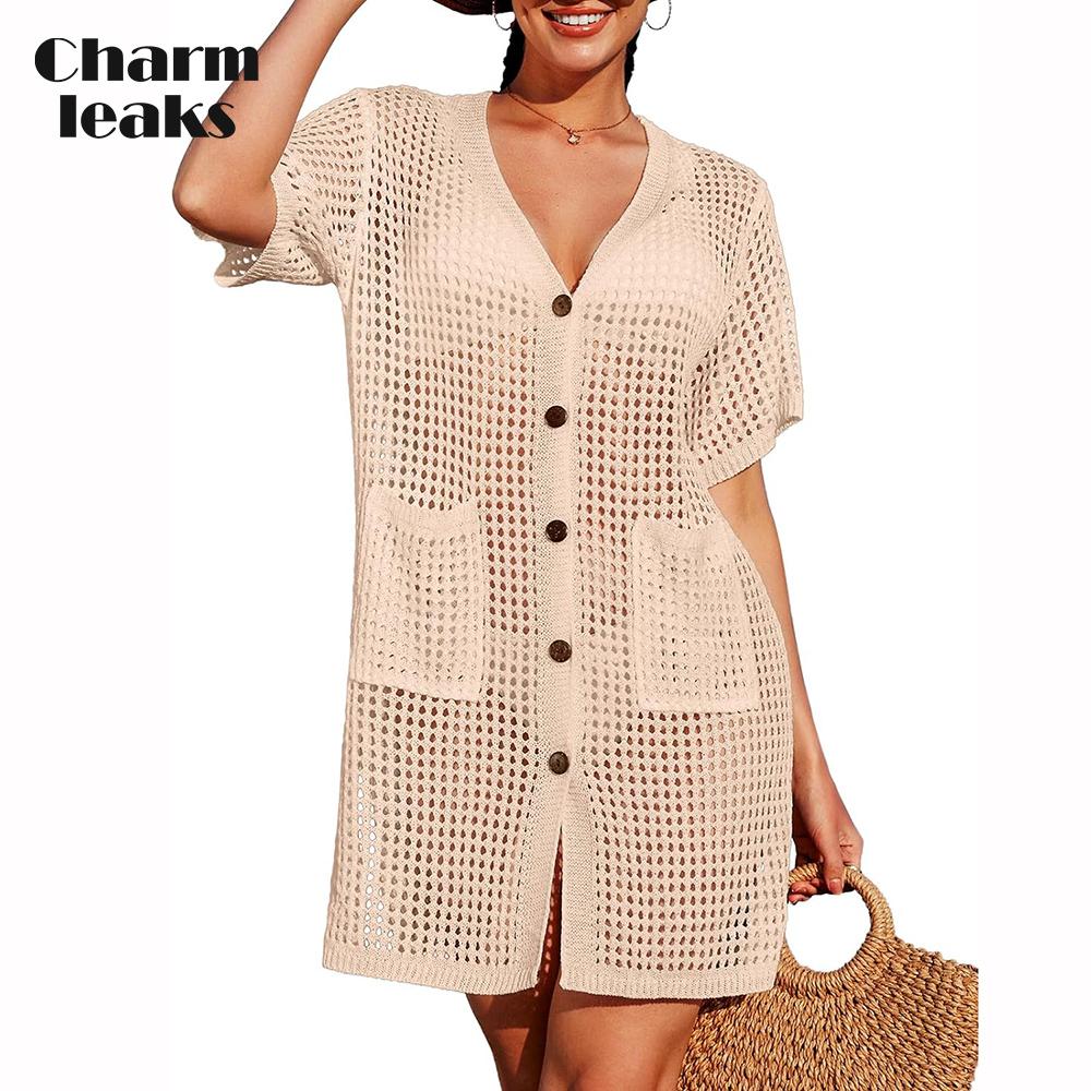 Charmleaks купальник накидка женское вязаное крючком пляжное платье на пуговицах с боковым разрезом купальный костюм накидки карманные купальники
