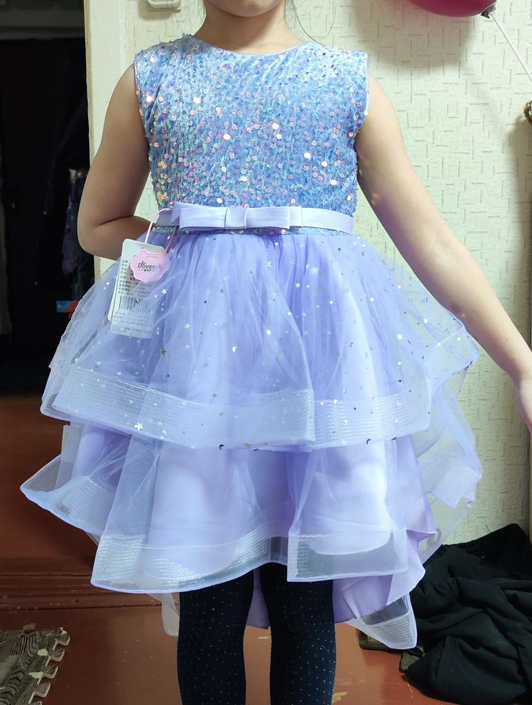 Платье красивое, на рост 120 мало в длине, пояс выше талии, и мне показалось коротковато. Фото не передаёт всей красоты и цвет на фото изменился. В реальности цвет нежно сиреневый
