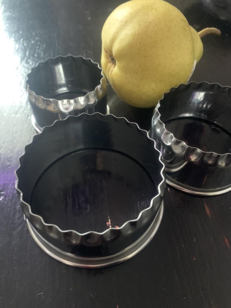 Набор из трех жестяных формочек С фестончатым краем. Для нарезания теста. Я люблю такие штучки, можно сделать красивые песочные печенья. Они хорошо держат форму при выпечке, край останется волнистым)) Пряничное тесто тоже пойдет)) Я люблю такое затеять, дети с удовольствием возятся с тестом. Получается немножко досуг с пользой. Три размера дают возможность делать пряничные башенки, между прочим. Это когда отдельные пряники склеивают между собой глазурью. Хорошая рождественская тема. Качество у форм отличное, жесть не тонкая, а режущий край в меру острый. Могу советовать.