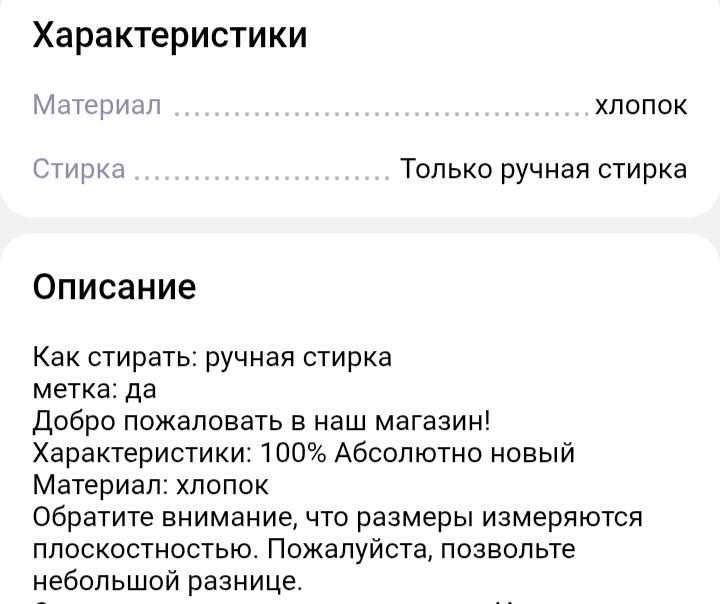 Описание вообще не соответствует! по факту - сплошная синтетика! На вшитом ярлыке в боковом шве указано - 100% полиэстер ! А в рекламе написано 100%хлопок! И я покупала хлопок! + ещё и без пуговиц! Подрывают доверие, верить написанному нельзя. Да, вернули 50%от стоимости, но носить не буду.
