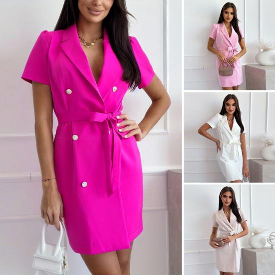 Характеристики: Основные особенности женского платья включают узкую талию с поясом, V-образный вырез с лацканами, однотонный, двубортный и однотонный дизайн..