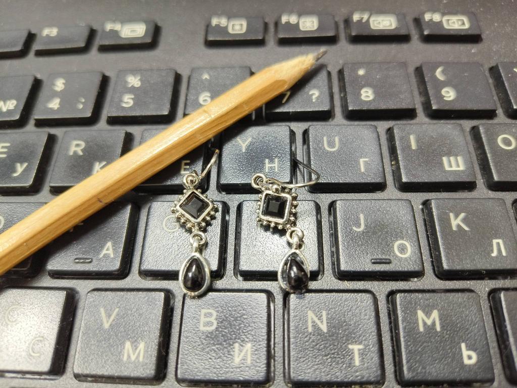 Очень маленькие серёжечки. Чёрные, а у меня было ощущение синих. Обычная бижутерия, не похоже на камешки - не лазурит. Оставлю - может переделаю. Но не стоят они этих денег.