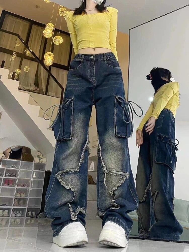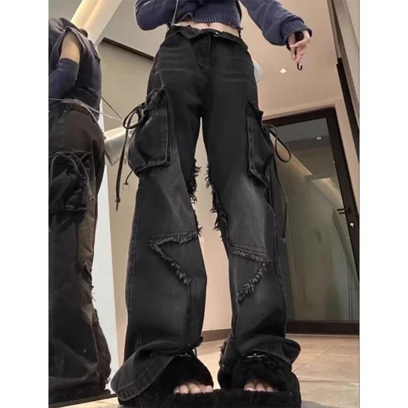 Женские черные готические мешковатые джинсы-карго со звездой Harajuku Y2k Эстетические джинсовые брюки 90-х годов Джинсовые брюки эмо 2000-х годов Винтажная одежда