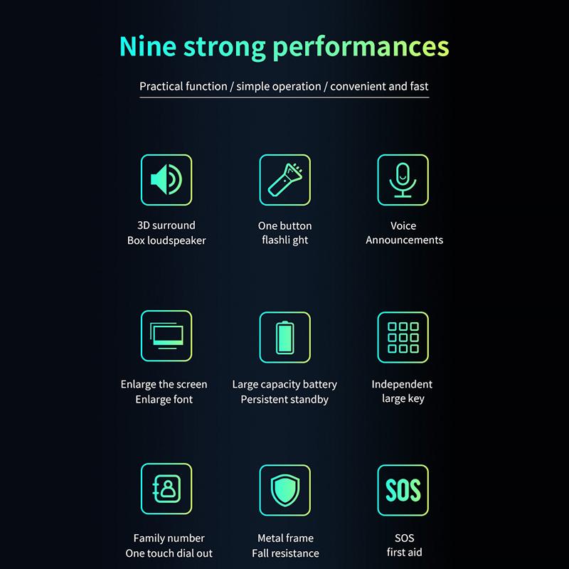 Сохраните 300 телефонных номеров, нажмите и удерживайте номер *, чтобы открыть радио, клавиша #s может переключать режим отключения звука, музыки и вибрации, длительное нажатие клавиши экстренного вызова «SOS», разблокировка экрана (Подвесной ключ), отверстие для веревки с отверстием для веревки