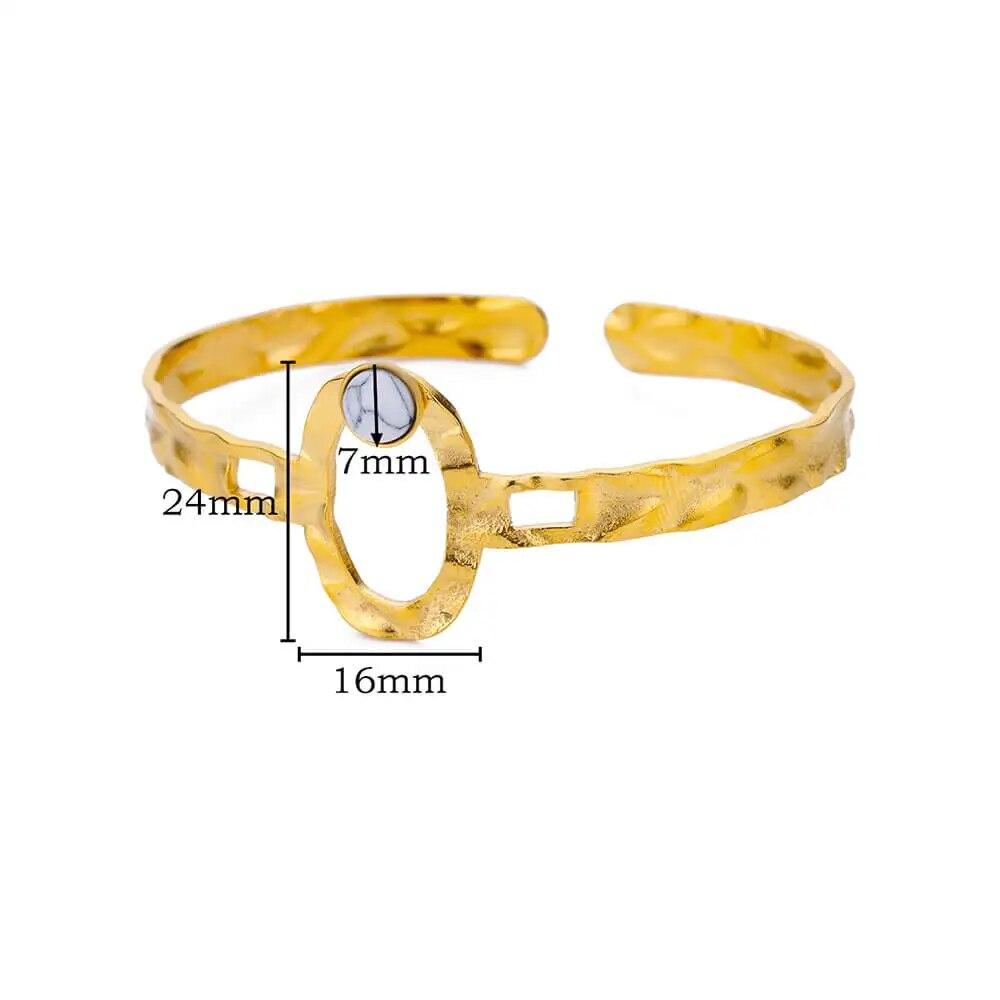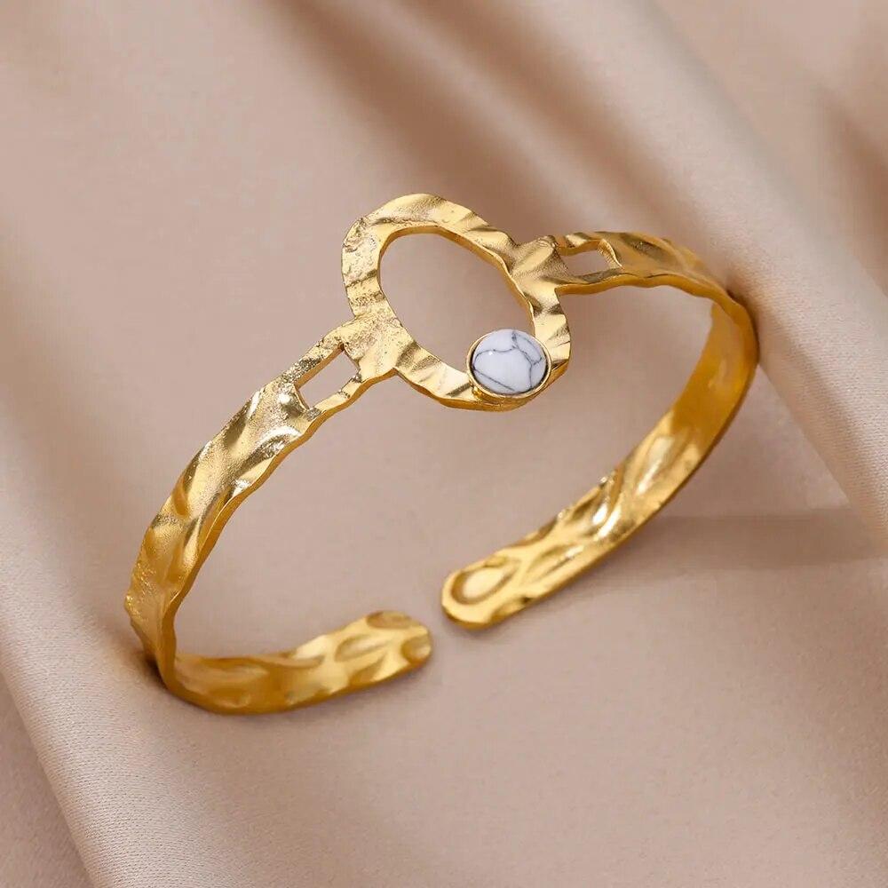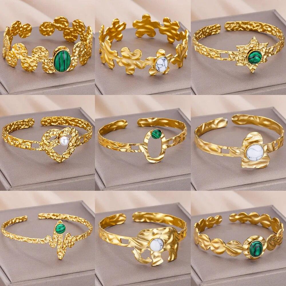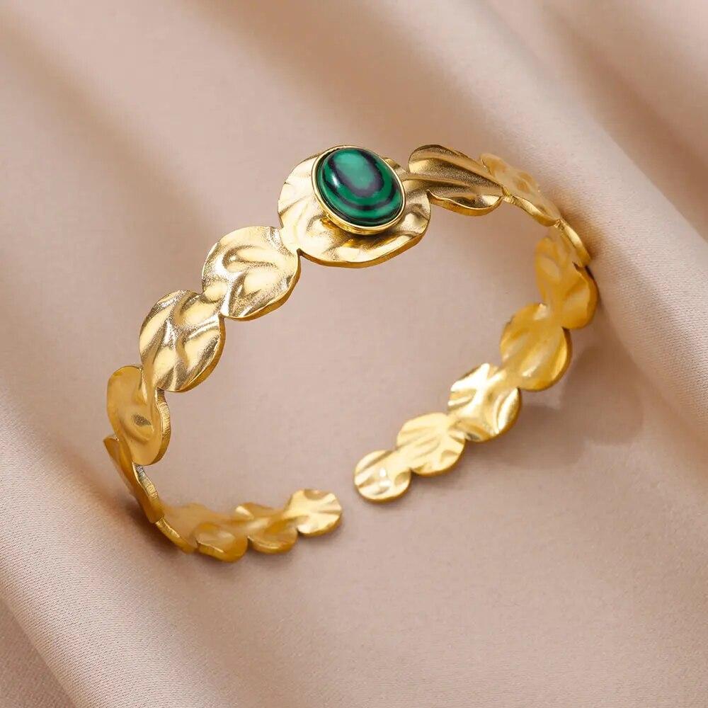 Женский браслет-манжета из искусственного зеленого камня из нержавеющей стали золотого цвета, женские винтажные ювелирные аксессуары