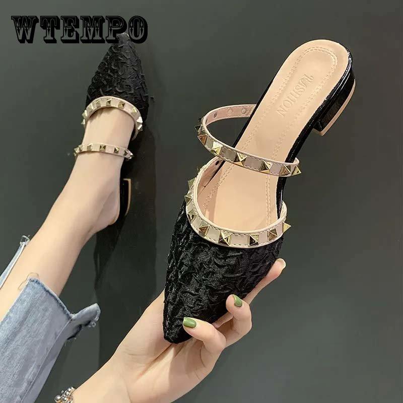 Женские босоножки на массивном каблуке с острыми заклепками, полутапочки Baotou, женские пикантные сандалии из мягкой кожи, тапочки с острым носком на низком каблуке — купить товар онлайн с бесплатной доставкой до всему миру!