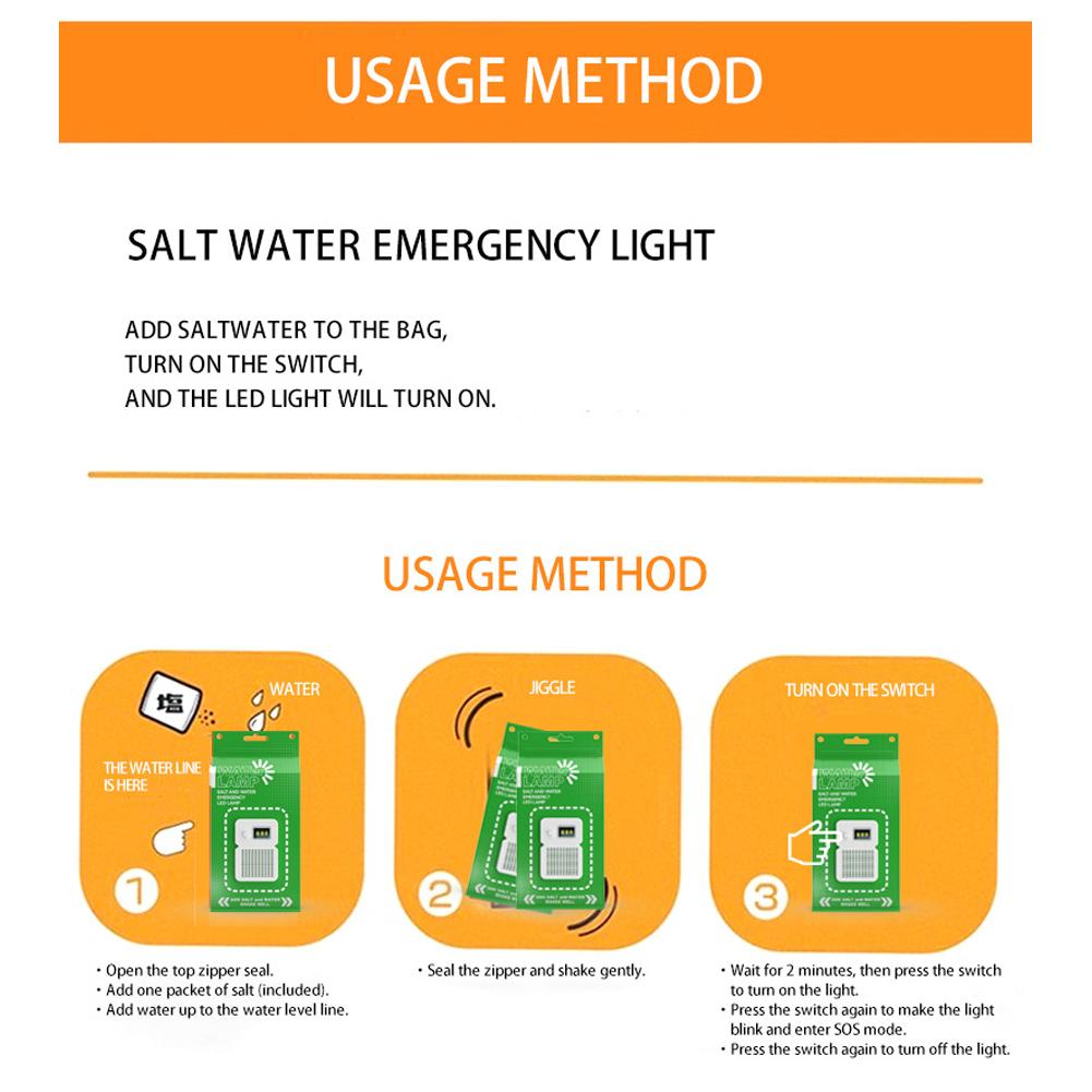 Портативный и экологически чистый: Аварийное освещение соленой воды питается от электролита соленой воды, что исключает необходимость подзарядки или установки батареи.. Просто добавьте воды, чтобы активировать его, и качество воды не повлияет на это.