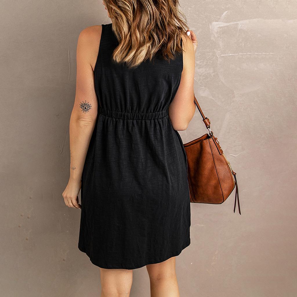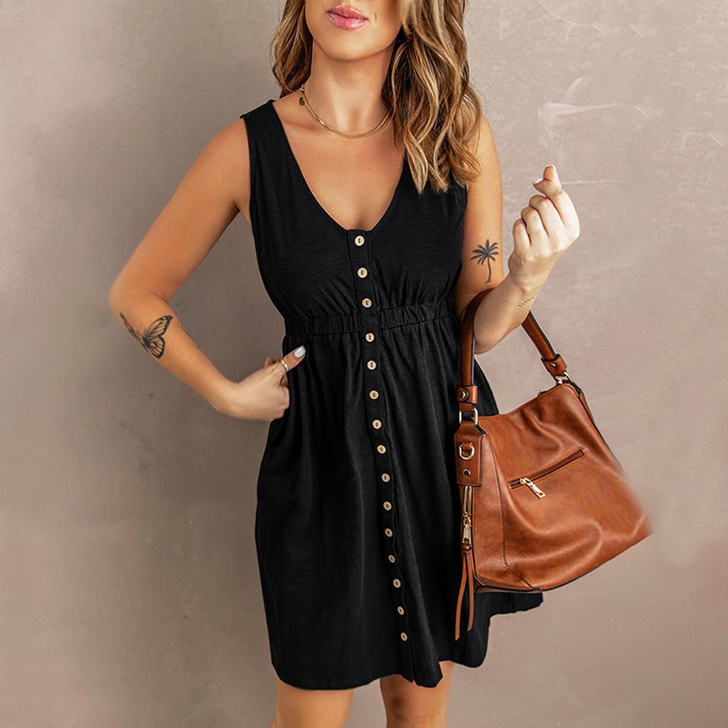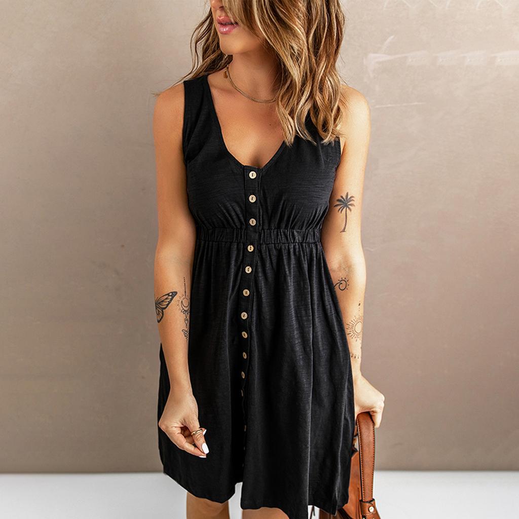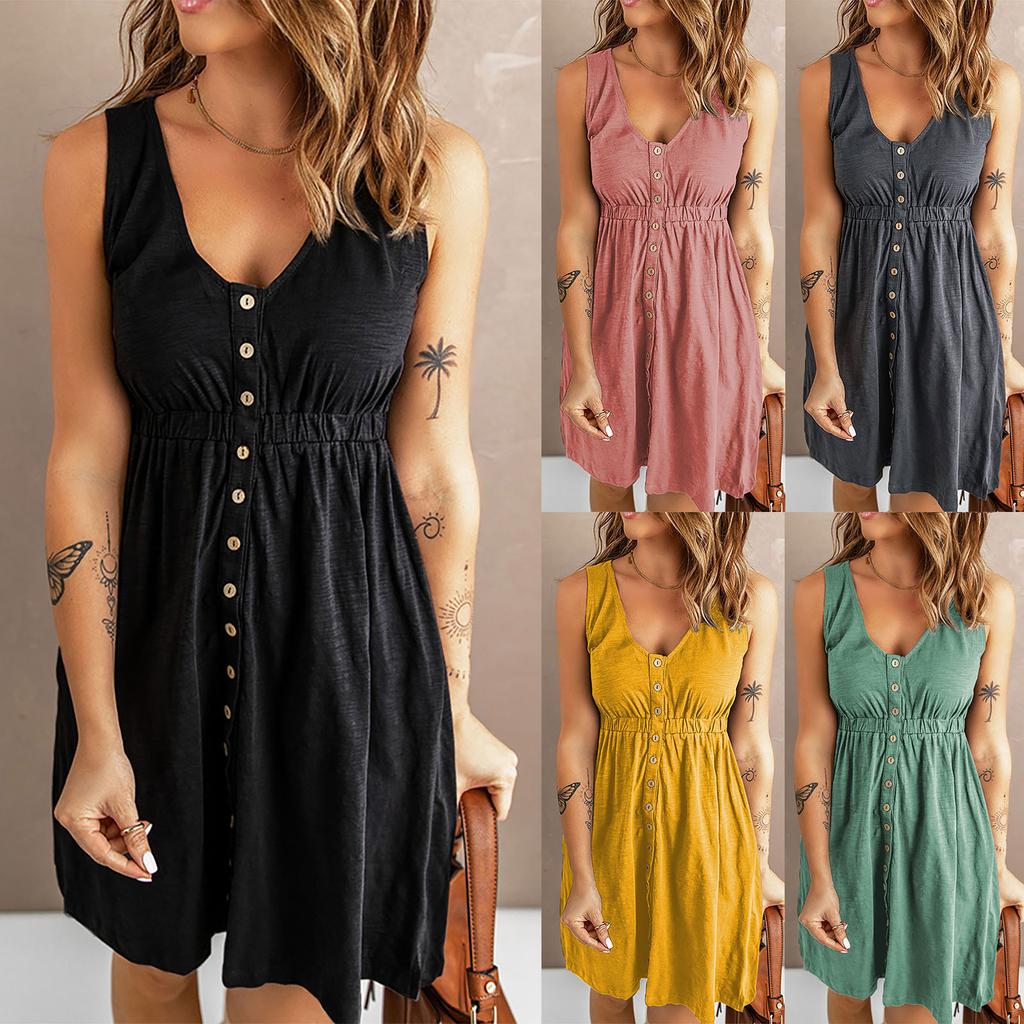 Женское повседневное платье без рукавов с v-образным вырезом на пуговицах, летние платья трапециевидной формы с эластичной резинкой на талии