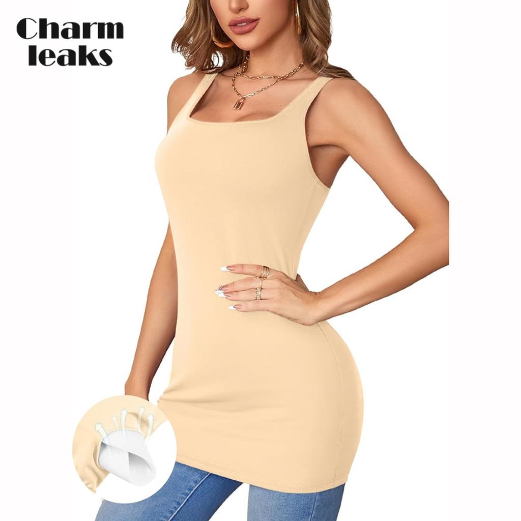 CHARMLEAKS Женская длинная майка с бюстгальтером с квадратным вырезом и широкими бретелями, летние хлопковые майки