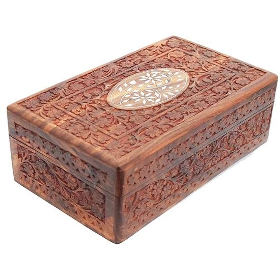 Деревянный ящик для хранения Sheesham, 25 см. Эта шкатулка для драгоценностей с ручной резьбой, изготовленная с высокой точностью из высококачественной древесины шишам, известной своей долговечностью и богатым узором, представляет собой роскошное убежище для ваших сокровищ.