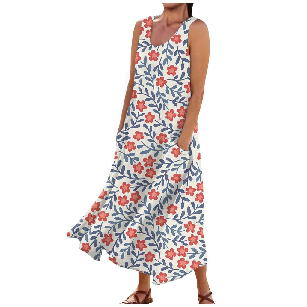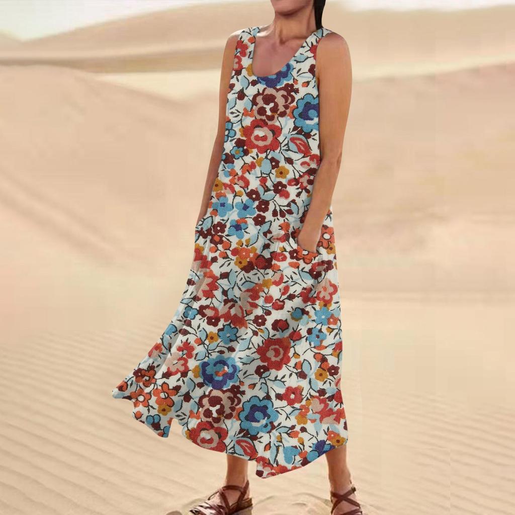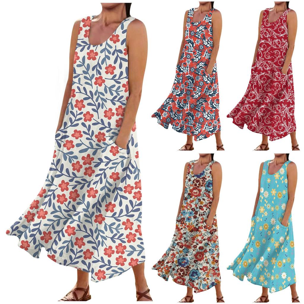 Женское повседневное удобное хлопковое карманное платье без рукавов с цветочным принтом