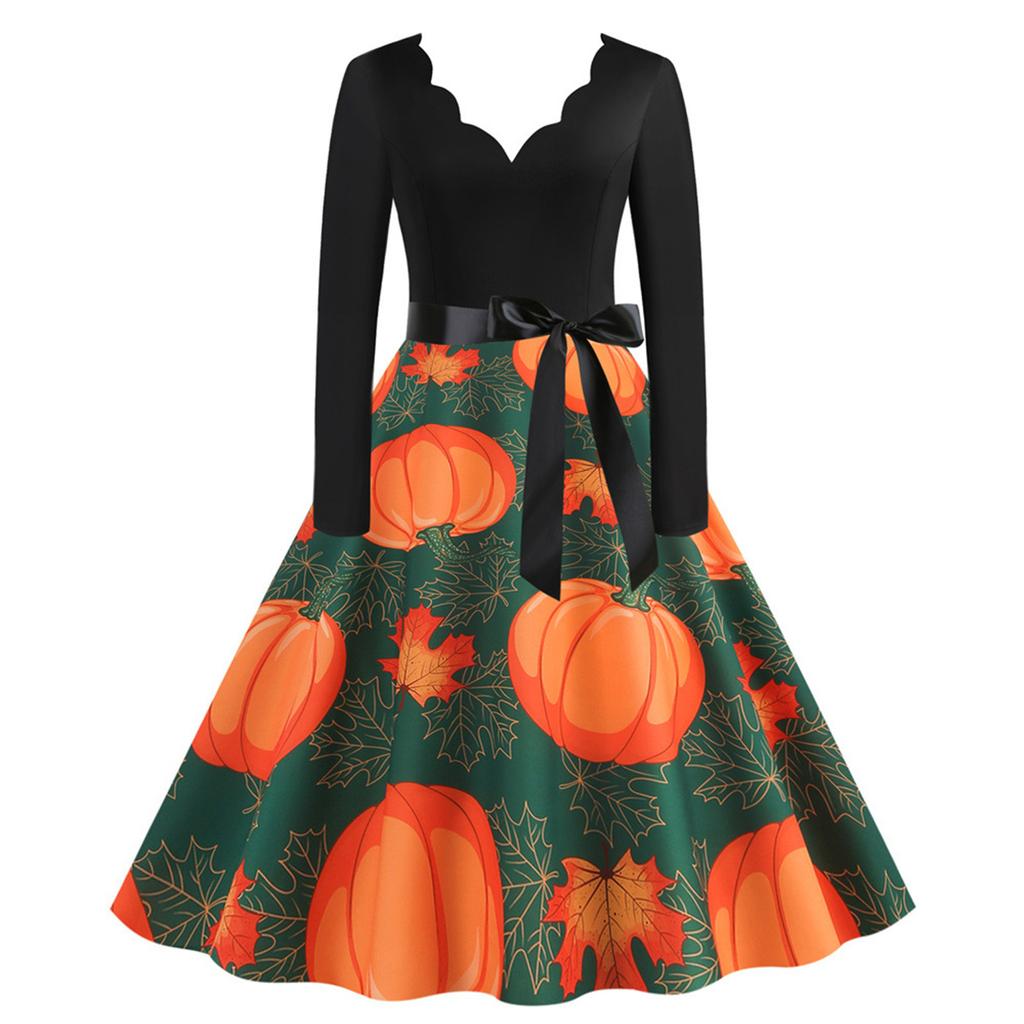 Женское модное повседневное платье с длинным рукавом и v-образным вырезом с принтом на Хэллоуин
