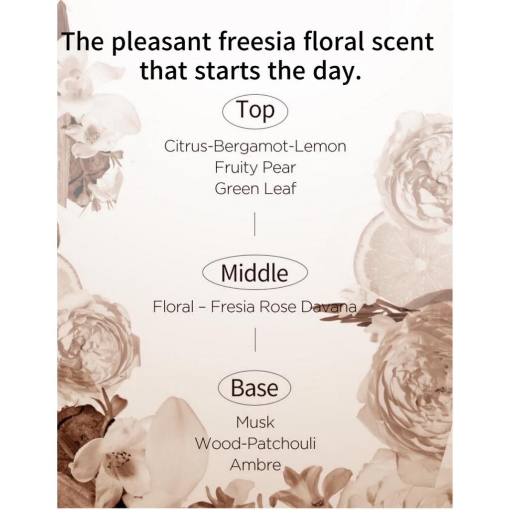Ингредиенты : Вода очищенная, диэтоксиэтилсукцинат, миристиловый спирт, изопентилдиол, стеарамидопропилдиметиламин, глицерилат, ароматизатор, молочная кислота, бутиленгликоль, этилгексилглицерин, динатриевые дитиевые кислоты, лимонен, гидролизованный пищевой белок, 1,2-гександиол, гераниол, экстракт дамасской розы, нуклеосиннамал, линалоол. , масло косточковых бобов, стерол косточковых бобов, экстракт плодов черники, маннит, альгинин, серин, гексилаурат, цитронелол, сахароза, экстракт сахарного тростника, PCA, цитруллин, масло авокадо, декстрин, гликоген, гистидин EichCL, аланин, экстракт апельсина, экстракт лимона, треонин, экстракт женьшеня, бензоат натрия, цетерариловый спирт, глутаминовая кислота, токоферол, гидрохлорид лизина, экстракт монофильного сахара, лецитин, асковилмитат, гидрогенизированный цитрат пальмовой глицеразы, гидролизованная коллагеназа, гидролизованная коллагеназа