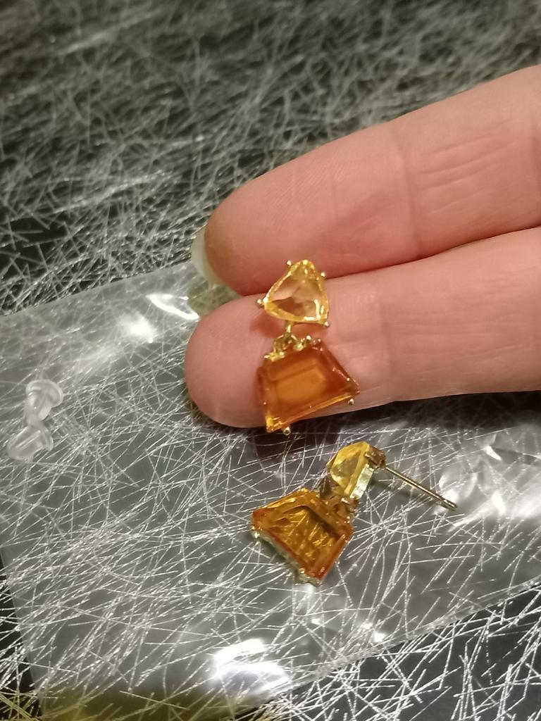 Серьги маловаты и прозрачное стеклышко. Хотелось, чтоб более коричневое было, на фото продавца есть глубина цвета, а так теряется в волосах. Но носить иногда буду)))