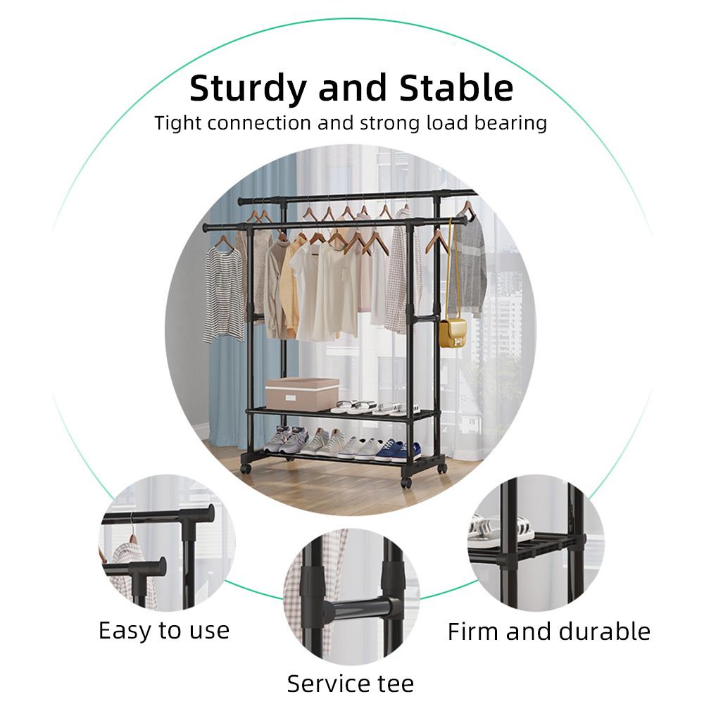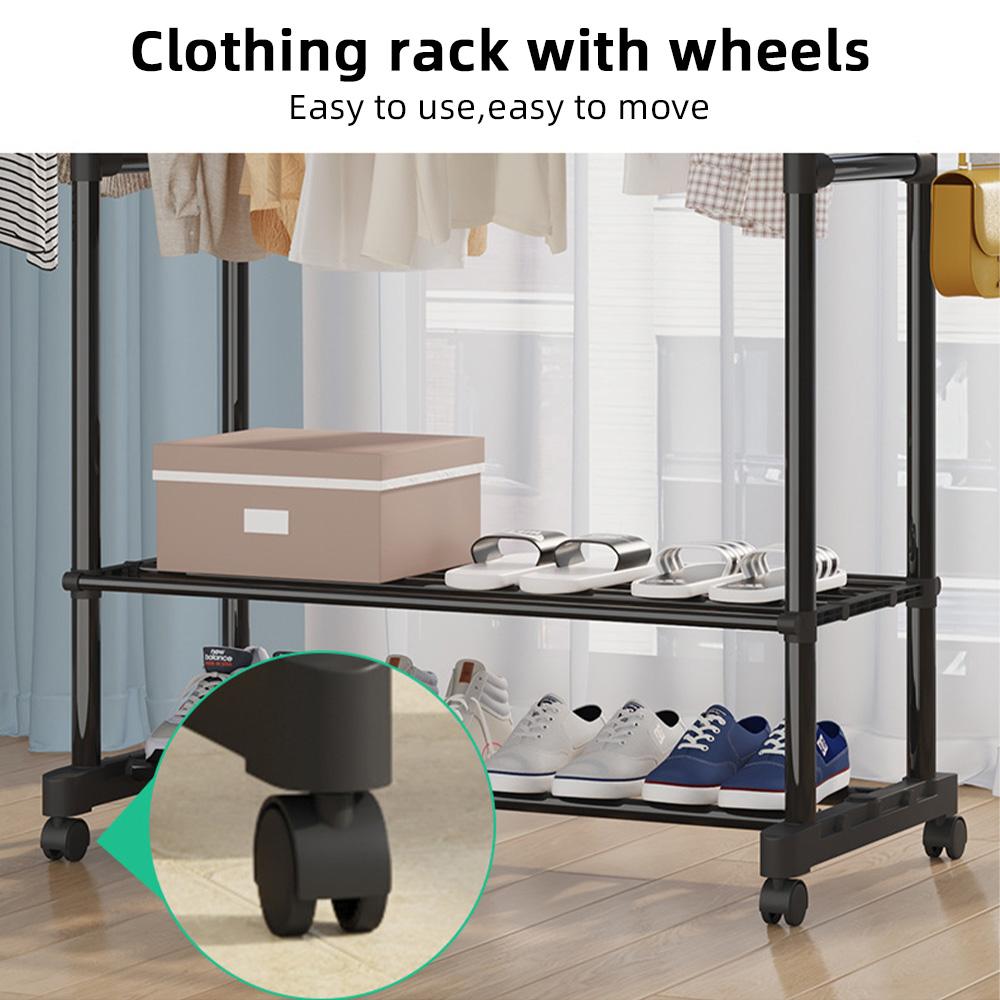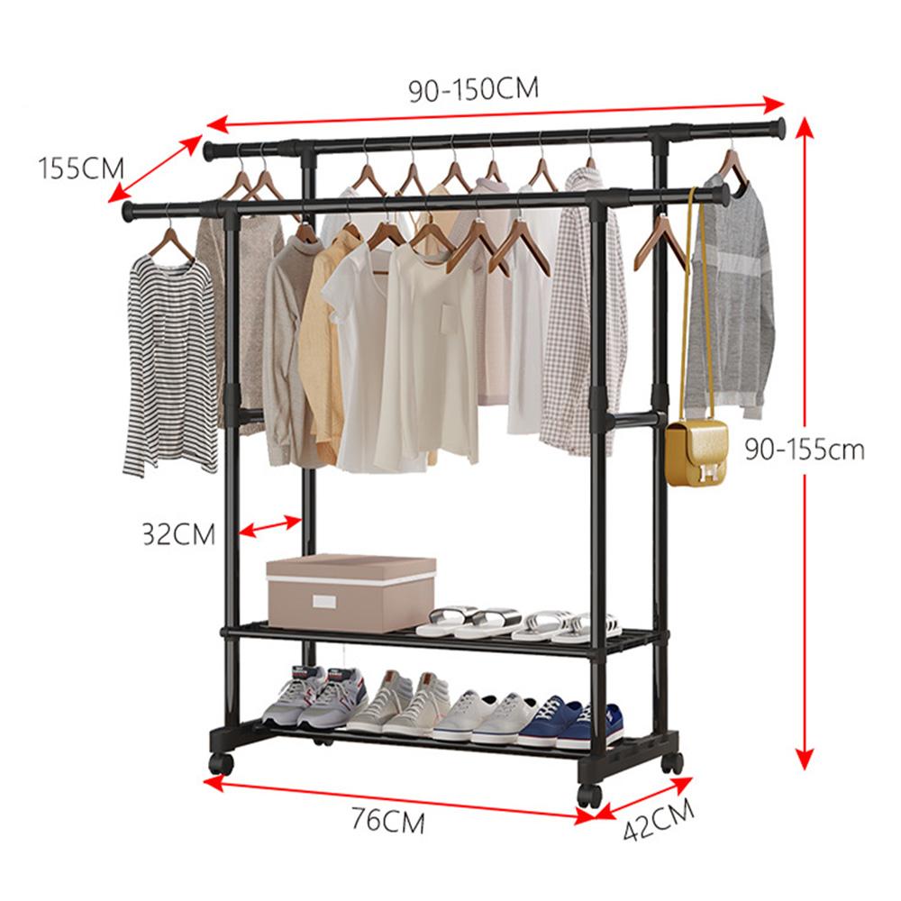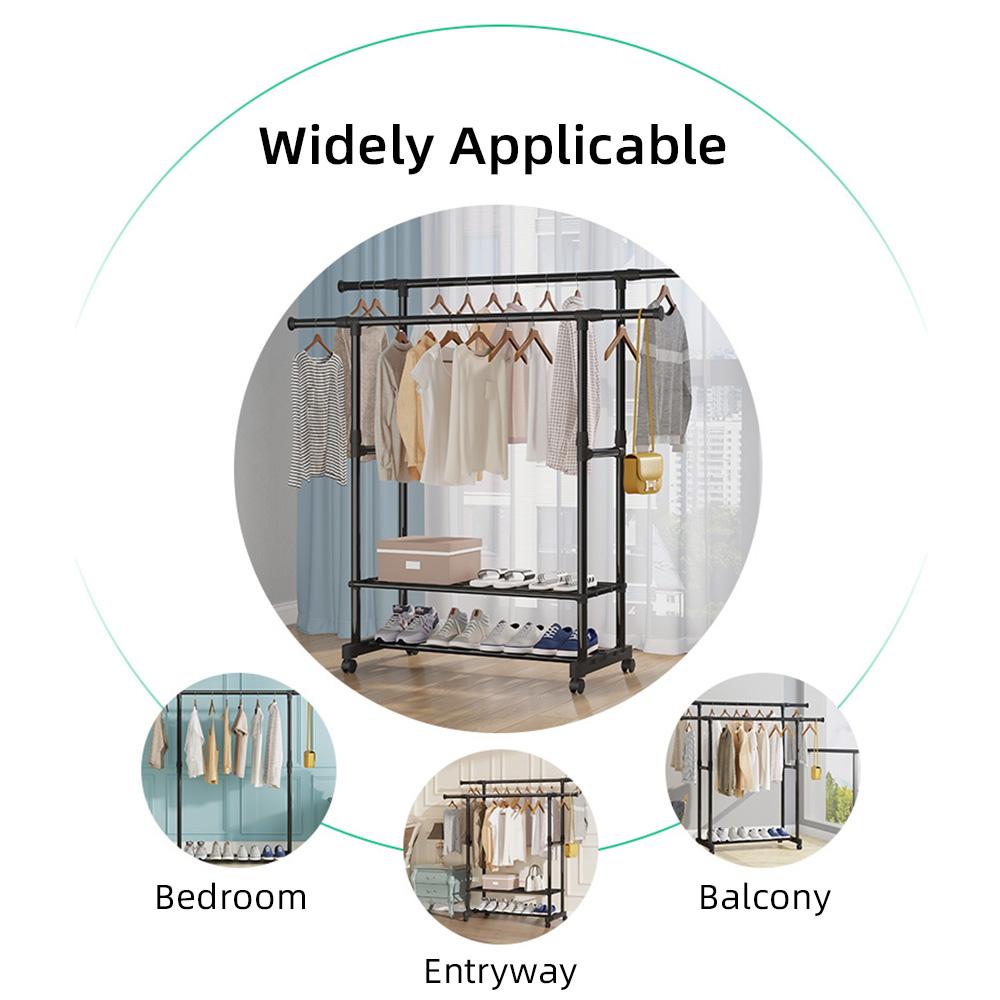 Свободно регулируемая вешалка для одежды с колесами и телескопической штангой. Вы можете регулировать высоту и длину стойки, а также высоту полки в соответствии с вашими потребностями, например, для сушки одежды разных размеров и хранения обуви.