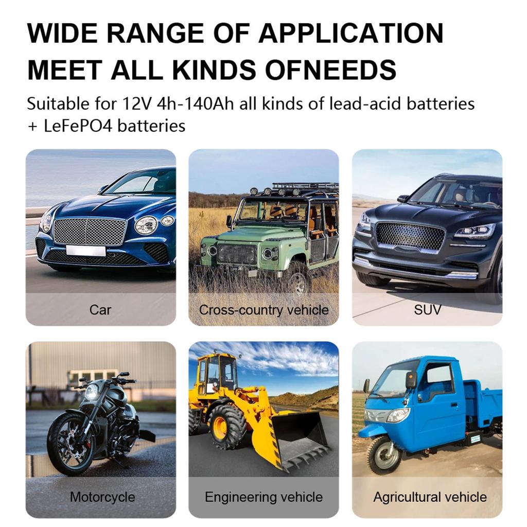 Подходит для различных батарей: Подходит для мотоциклов, автомобилей, внедорожников и аккумуляторов 12 В, 4 Ач-140 Ач, водяных аккумуляторов, свинцово-кислотных аккумуляторов, необслуживаемых аккумуляторов, аккумуляторов LIFEPO4.
