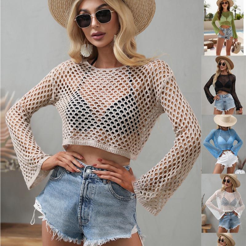 Летняя свободная трикотажная блузка с открытыми плечами, женские повседневные рубашки с расклешенными рукавами и круглым вырезом для женщин, модные элегантные однотонные укороченные топы 24123 — купить товар онлайн с бесплатной доставкой по всему миру!