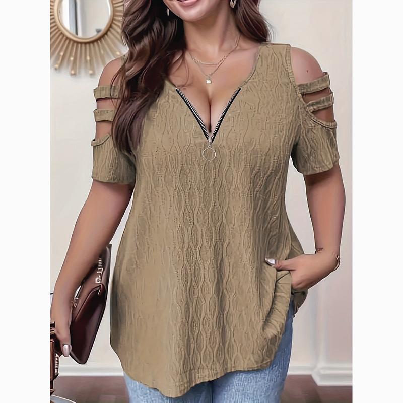 Летняя однотонная женская футболка с открытыми плечами на молнии с v-образным вырезом, топы с коротким рукавом, повседневная футболка больших размеров, женская мода, элегантные вязаные футболки 24125