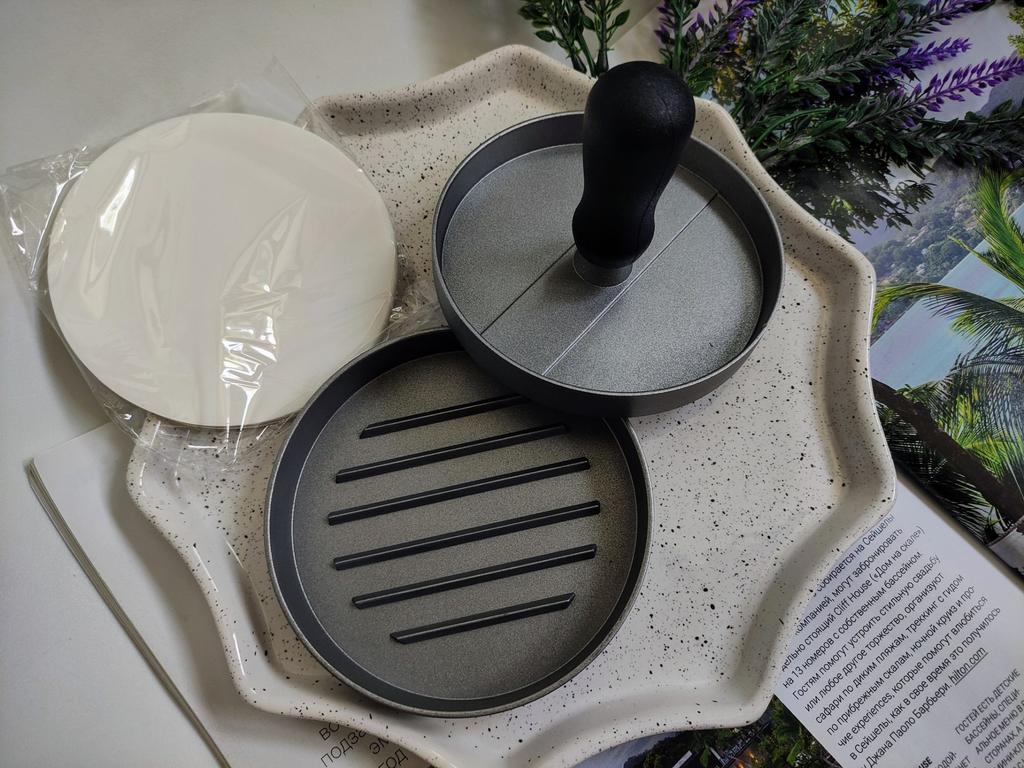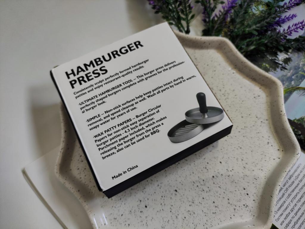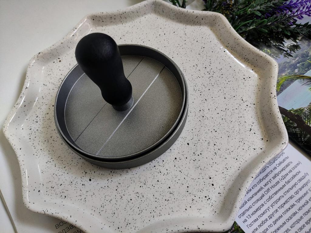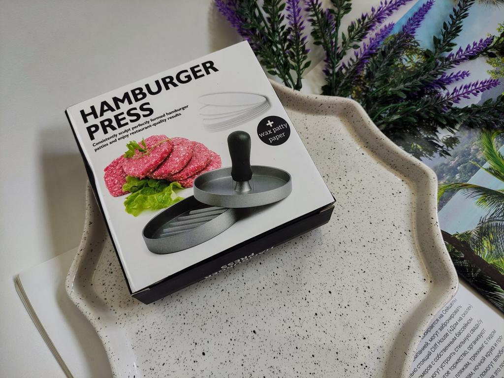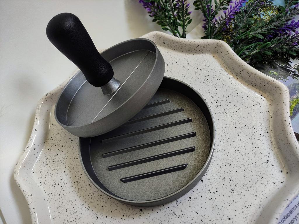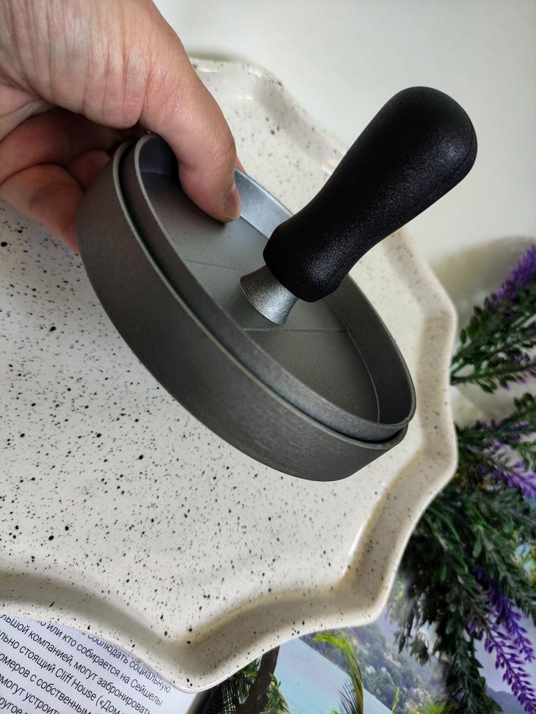 Пресс для приготовления бургеров Очень удобный девайс, я оценила. С ним все котлетки одинаковые и идеально ровные. В комплекте есть 100 листов пергаментной бумаги для лучшего извлечения котлеты из пресса. Но я обхожусь и без нее. Если очень хорошо вымесить мясо, оно неплохо выскакивает из пресса. Необходимо только зубочисткой провести по окружности котлеты, два раза хлопнуть и котлета вылезает из формы. Очень удобно и то, что этим прессом можно нажимать на котлеты чтобы они не сильно уменьшались в диаметре во время жарки. Чтобы котлеты были сочными я использую фарш ассорти, добавляю чеснок, соль и перец. И очень хорошо вымешиваю его. Булочки будут вкуснее если вы их немножко поджарите на сковородке. Если булочка влезает в тостер, я их там и припекаю. У меня на фото булочки XL, поэтому котлетка кажется маленькой по отношению к ней. Диаметр пресса 11 см. Изготовлен из алюминия. Ручка - пластик. Рекомендую 🤗