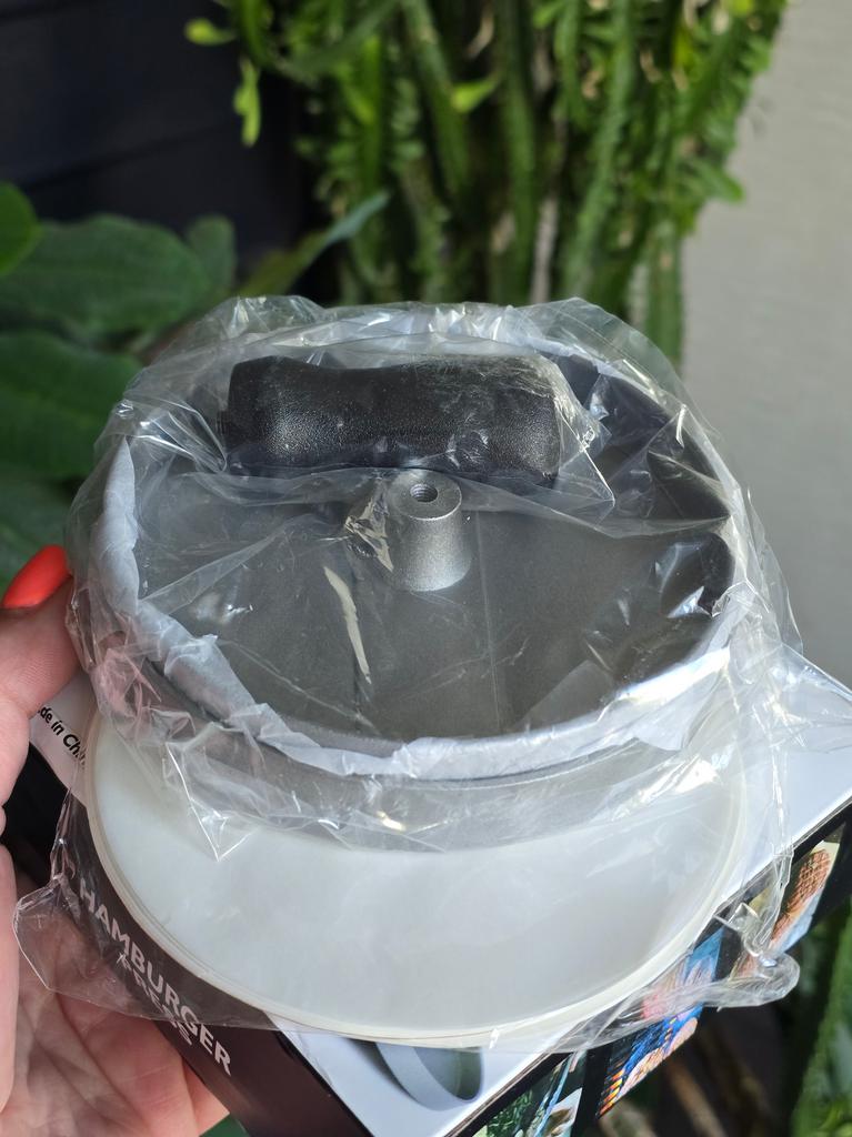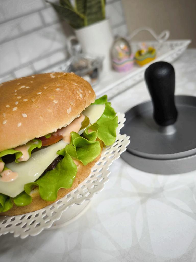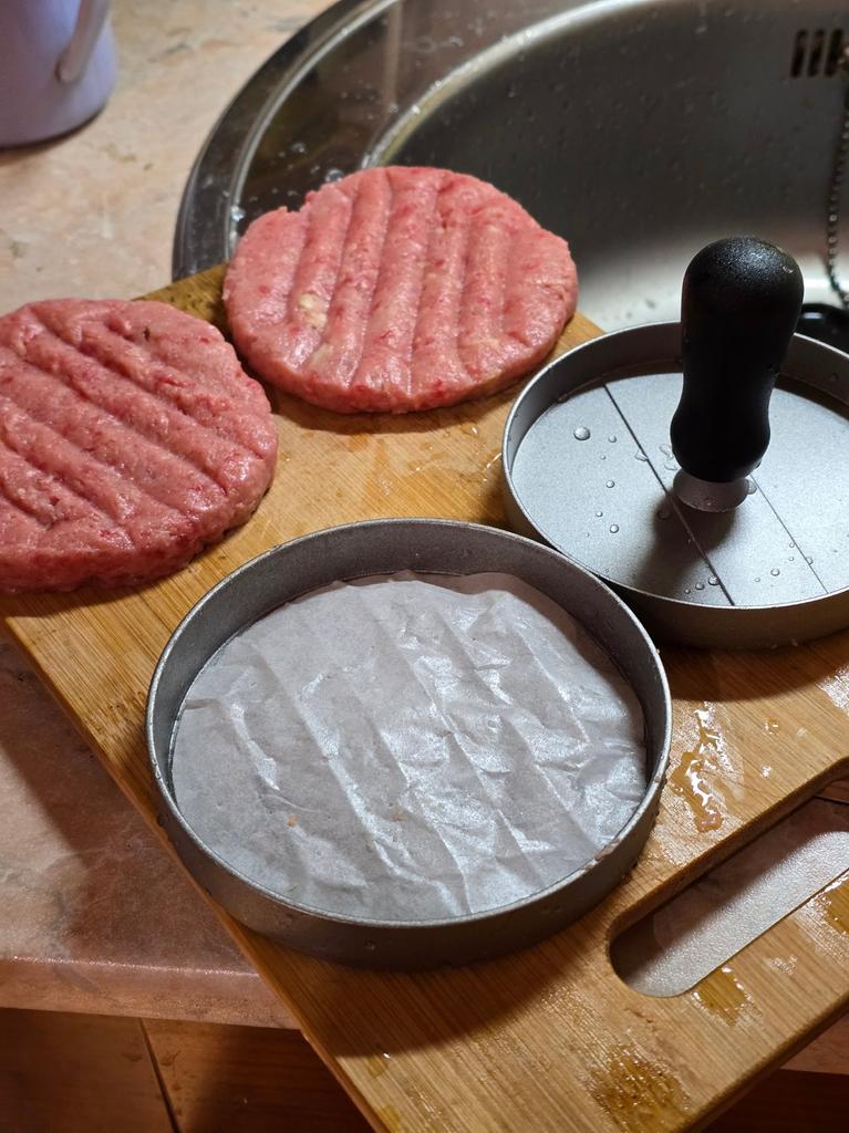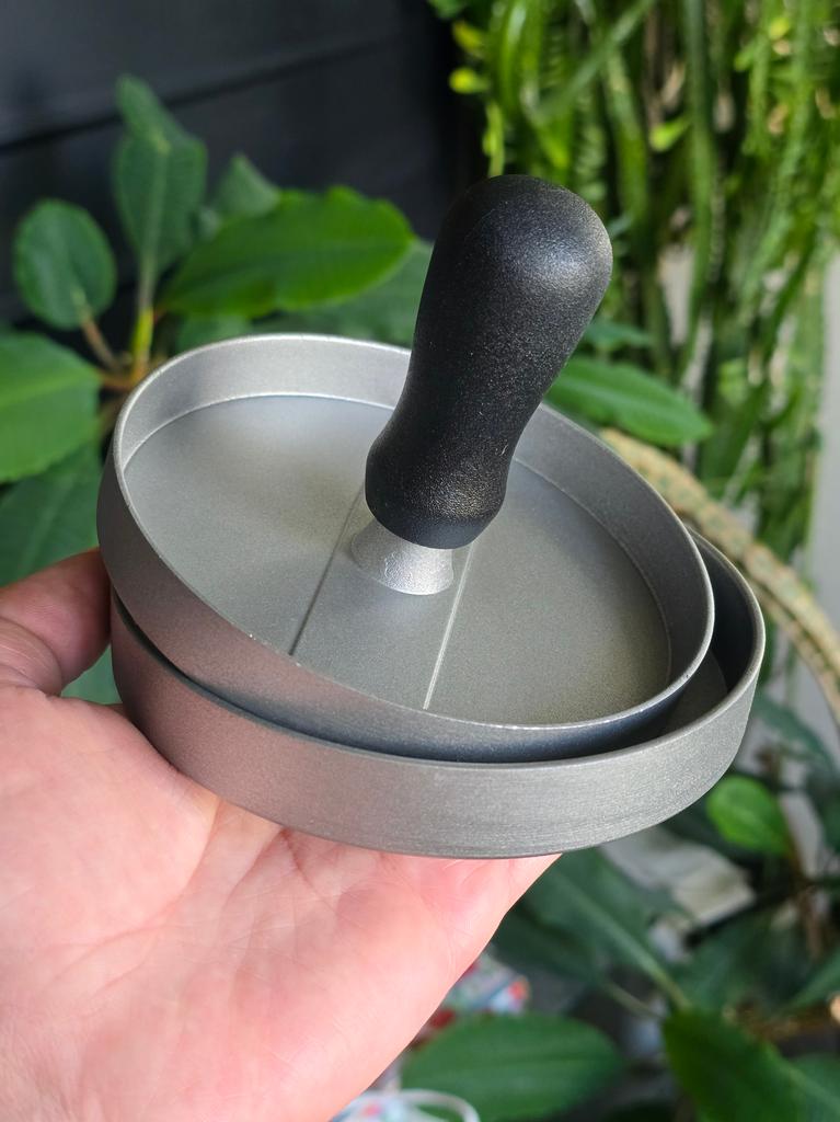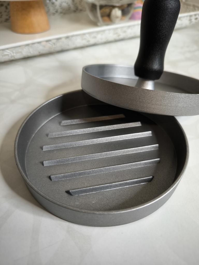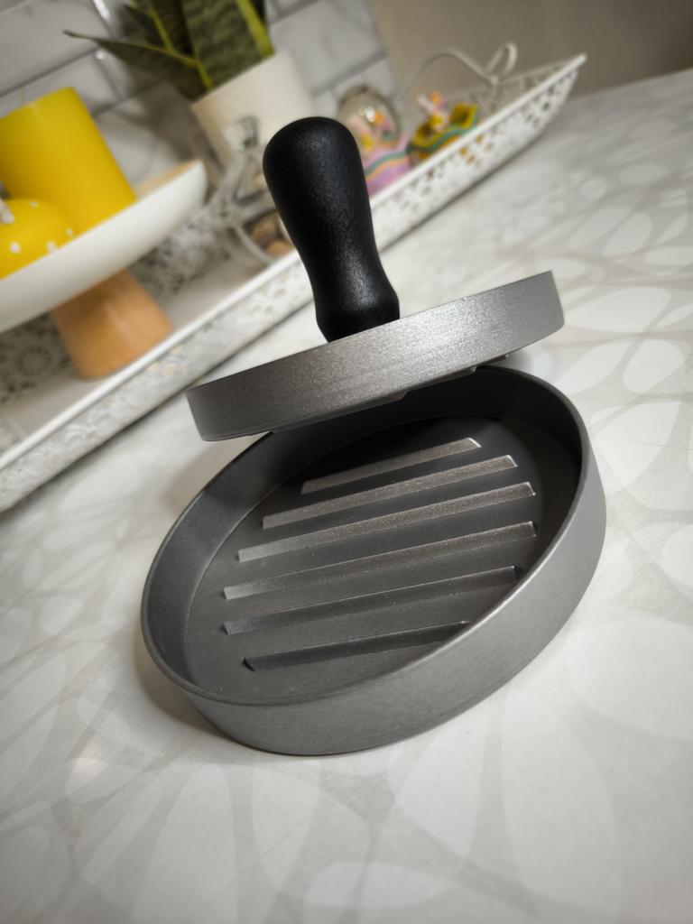 Пресс для приготовления бургеров Очень удобный девайс, я оценила. С ним все котлетки одинаковые и идеально ровные. В комплекте есть 100 листов пергаментной бумаги для лучшего извлечения котлеты из пресса. Но я обхожусь и без нее. Если очень хорошо вымесить мясо, оно неплохо выскакивает из пресса. Необходимо только зубочисткой провести по окружности котлеты, два раза хлопнуть и котлета вылезает из формы. Очень удобно и то, что этим прессом можно нажимать на котлеты чтобы они не сильно уменьшались в диаметре во время жарки. Чтобы котлеты были сочными я использую фарш ассорти, добавляю чеснок, соль и перец. И очень хорошо вымешиваю его. Булочки будут вкуснее если вы их немножко поджарите на сковородке. Если булочка влезает в тостер, я их там и припекаю. У меня на фото булочки XL, поэтому котлетка кажется маленькой по отношению к ней. Диаметр пресса 11 см. Изготовлен из алюминия. Ручка - пластик. Рекомендую 🤗