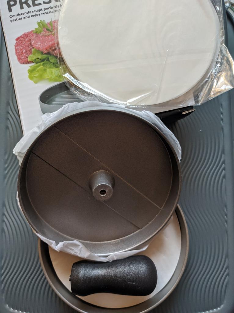 Пресс для котлет для гамбургеров 🍔 Идеально для красивых котлеток одного размера 👍 ✔️ Пресс приехал в фирменной коробочке, был хорошо упакована, качество замечательное, внешний вид и состояние идеальные. ✔️ Выполнен полностью из металла, ручка пластиковая съёмная, тяжеленький. ✔️ В комплект входят 100 вкладышей из пергамента, что очень удобно для заморозки. ✔️ Котлетки получаются быстро и легко, идеально круглые, как в лучших бургерных) Рекомендую товар и продавца 👍 ⭐⭐⭐⭐⭐