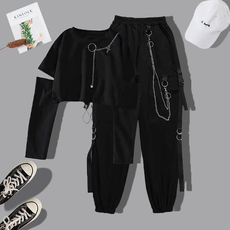 Весенне-осенние женские брюки-карго в стиле Харадзюку, красивый крутой костюм из двух предметов с цепочкой и длинными рукавами + брюки с лентой