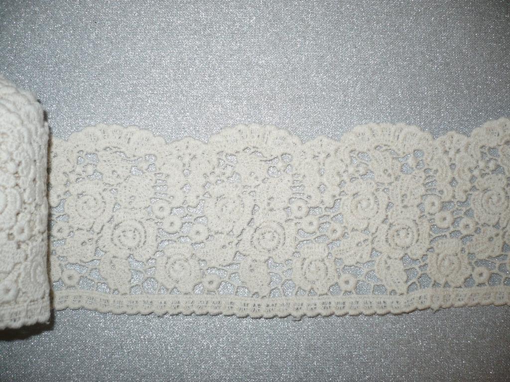 Приятное плотное кружево, пришло одним куском 3,6 м. Цвет очень светло-бежевый, ближе к кремовому