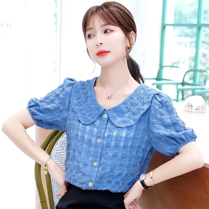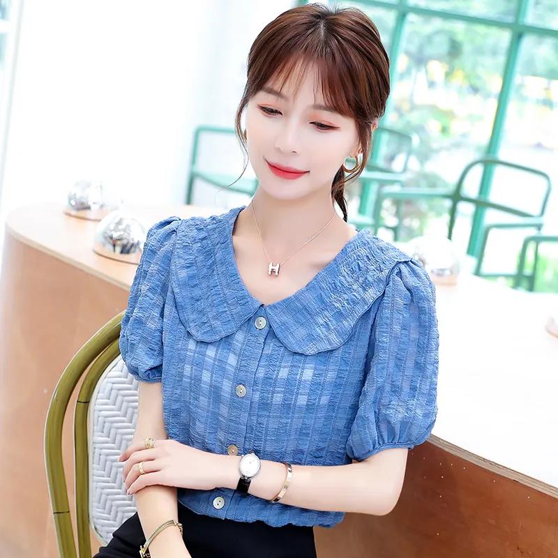 Летняя свободная однотонная шифоновая рубашка с короткими рукавами и кукольным воротником, женский топ