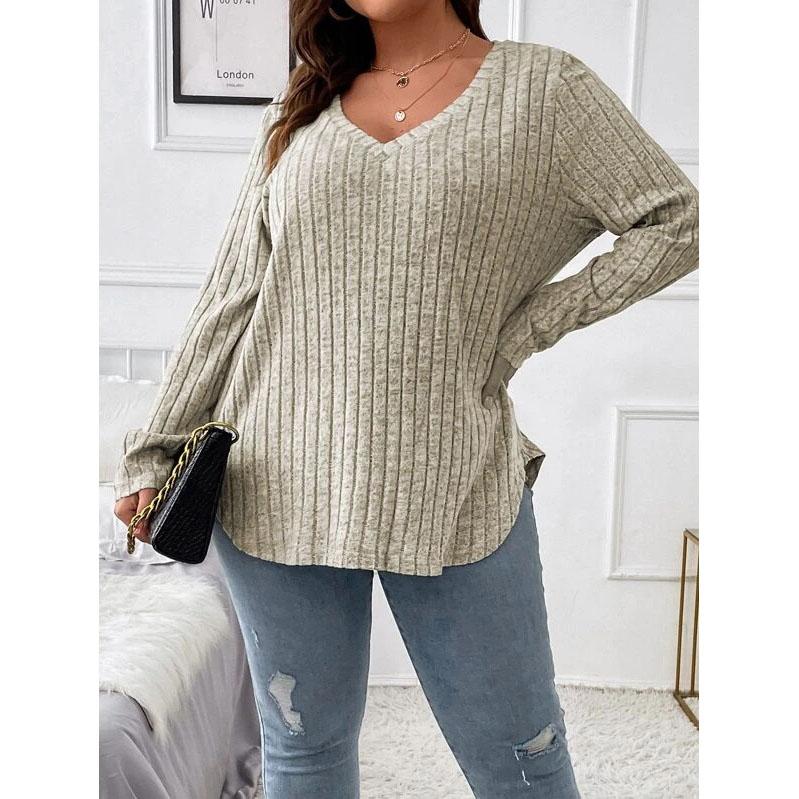 Женская осенне-зимняя рубашка, однотонная рубашка больших размеров, топ с v-образным вырезом и длинными рукавами, шерстяная футболка в полоску, свободный джемпер для женщин