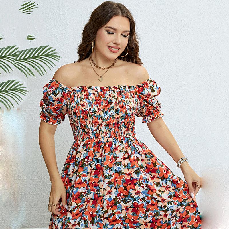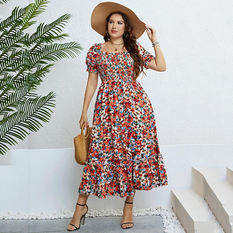 Летнее женское длинное платье с квадратным воротником и коротким рукавом с принтом, темпераментное элегантное тонкое пляжное платье больших размеров, повседневное дышащее платье с поясом