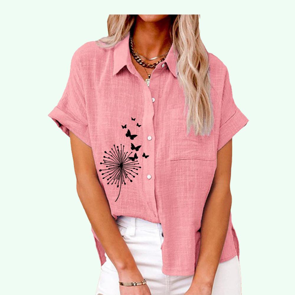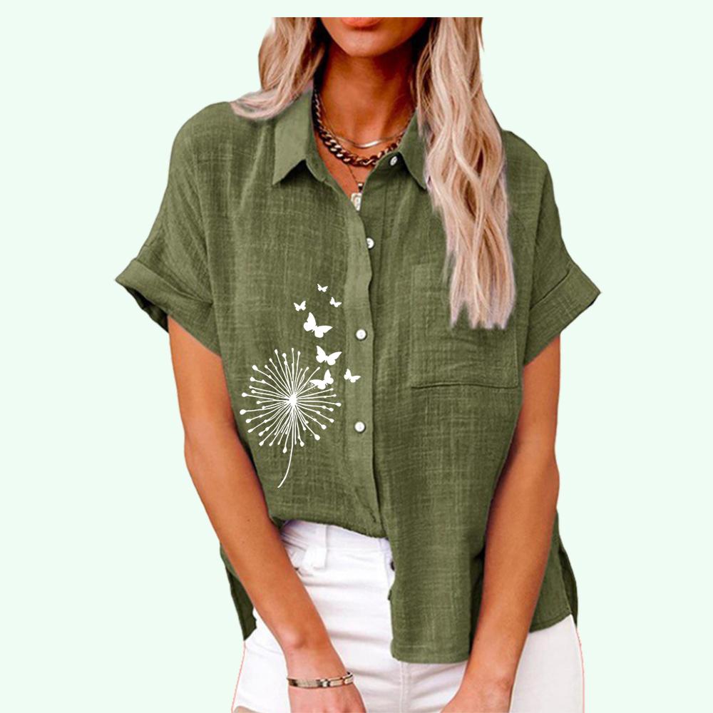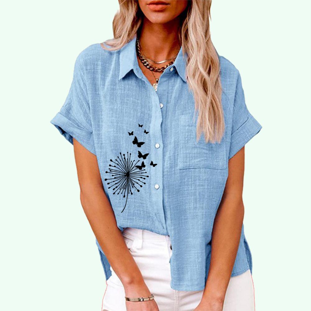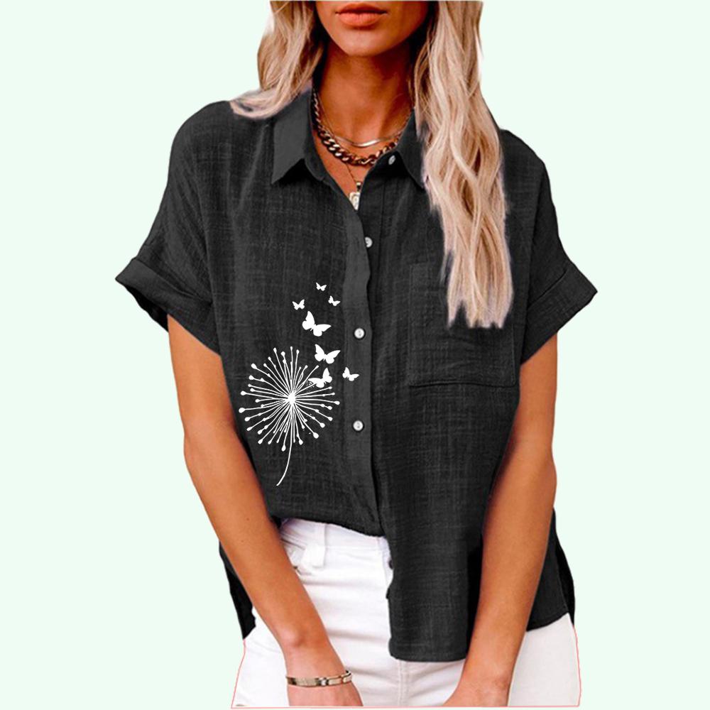 Женская модная футболка с отворотом и принтом, летняя и осенняя повседневная льняная футболка, женская футболка на пуговицах, свободные блузки с короткими рукавами