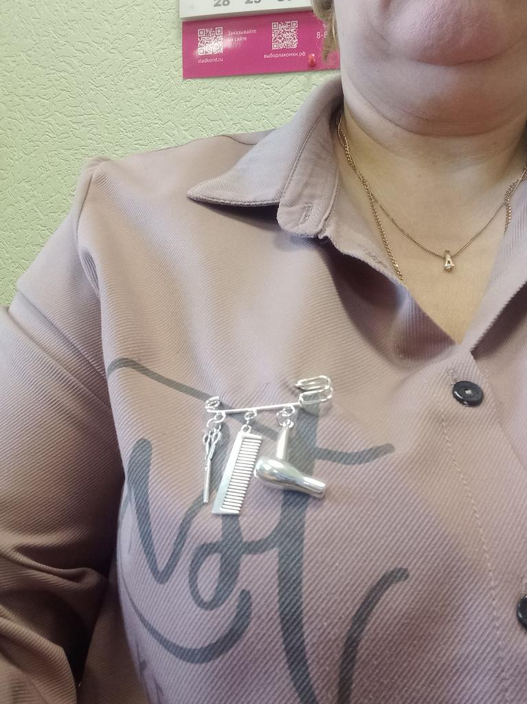 Серебряная брошь-подвеска для парикмахера с подвесками в виде фена, ножниц и расчески