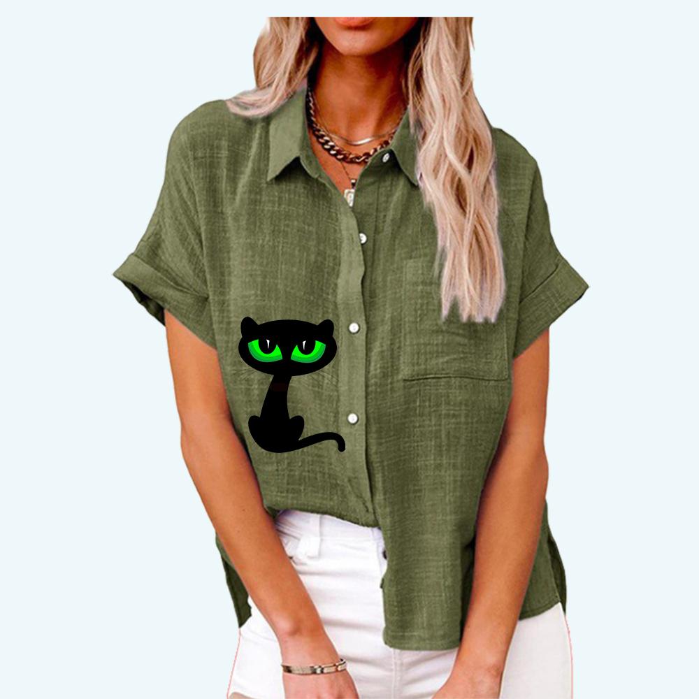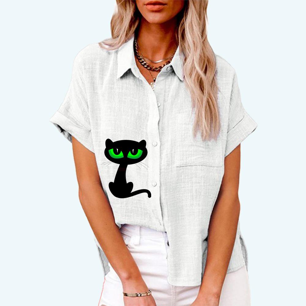 Женская мода, топ с воротником с лацканами, летняя и осенняя повседневная футболка с коротким рукавом, льняные блузки с карманом, кардиган с принтом кота, свободная рубашка